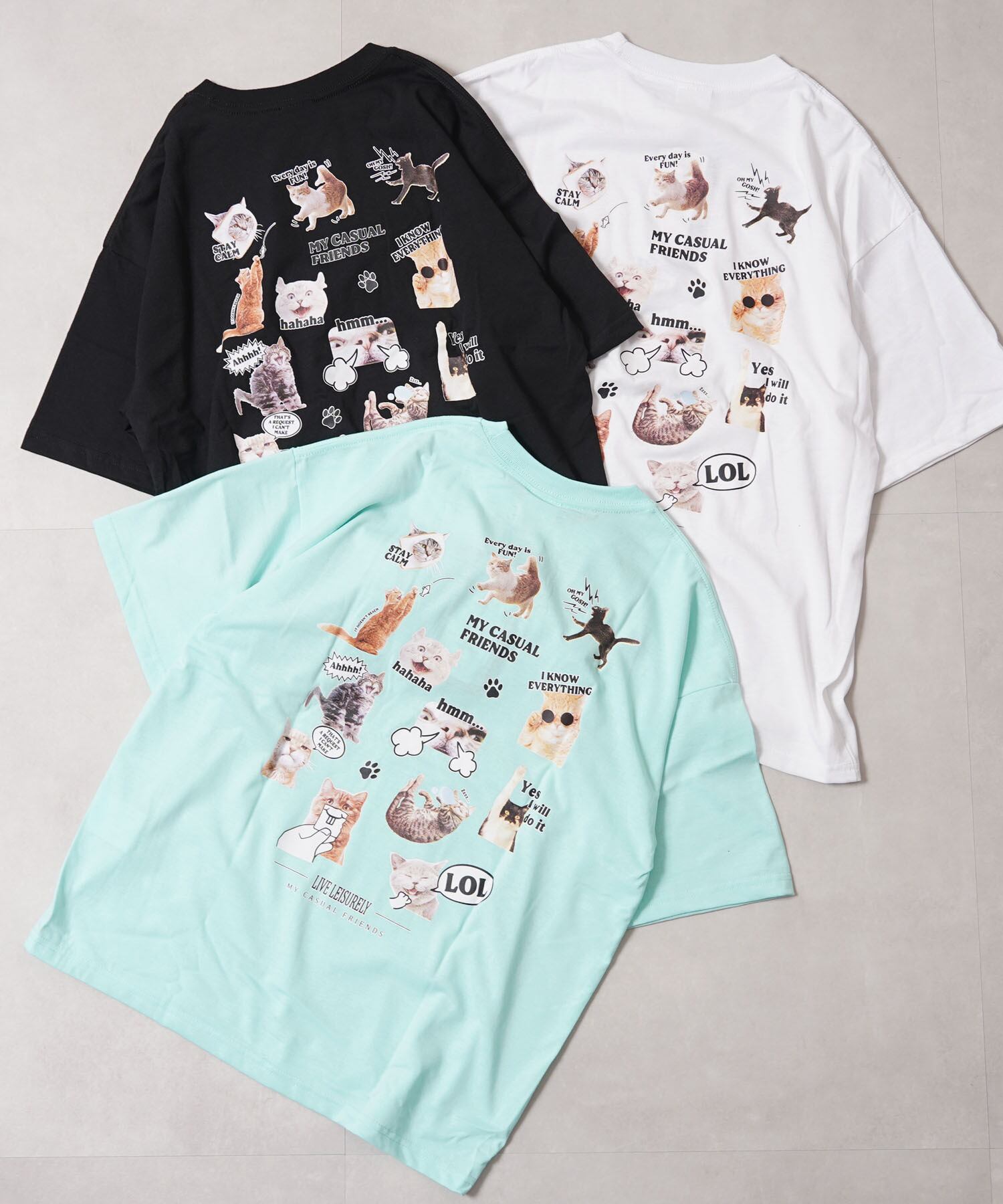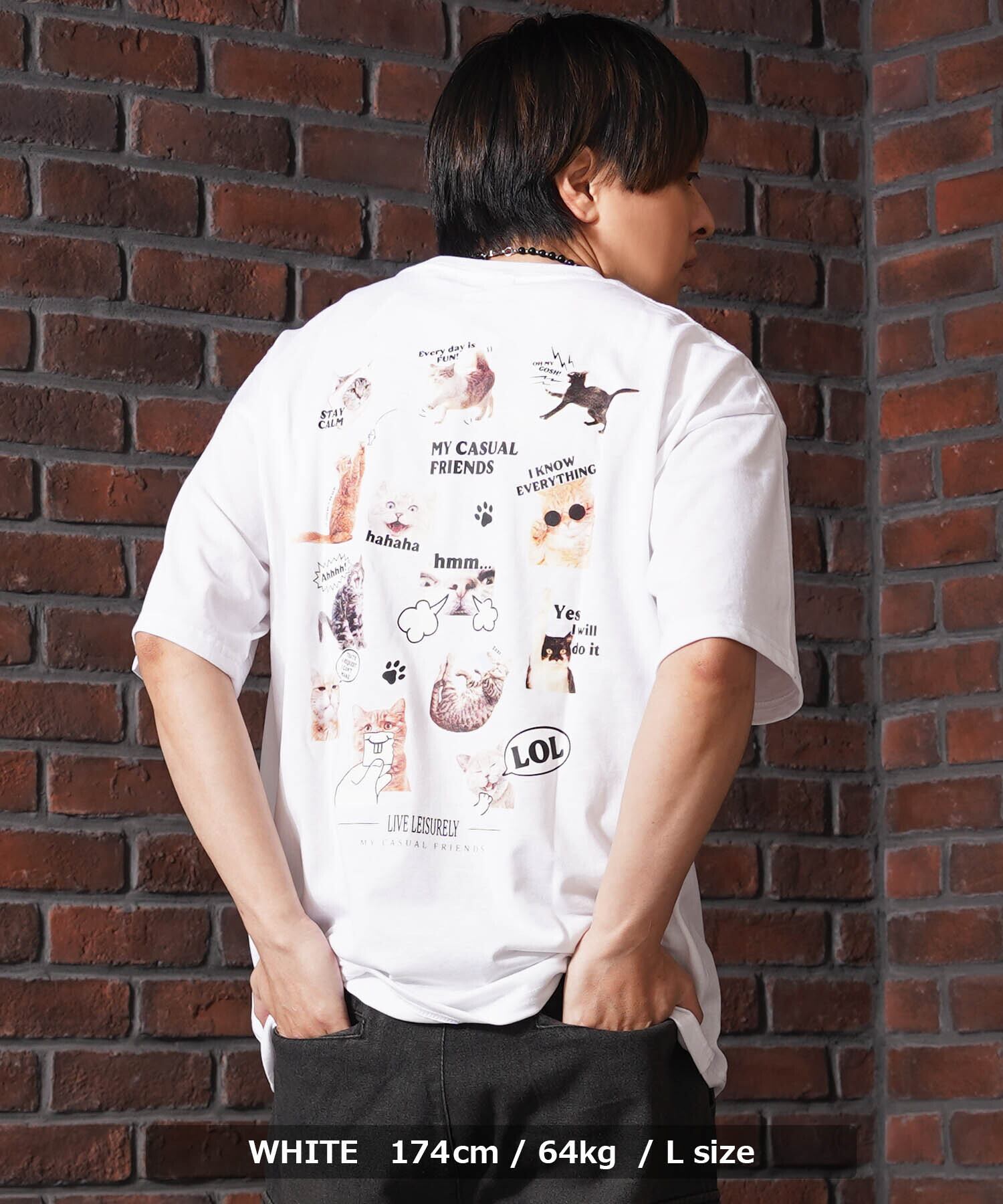 バックに猫をコラージュしたビッグTシャツ。フロントは淡色のワンポイントプリントで、コーデに取り入れやすいシンプル仕様。バックには様々なネコちゃんをコラージュした可愛らしいデザインで男女問わずおすすめのユニセックスアイテム。ゆったりとしたサイジングでリラックスして着られる夏に最適なプロダクトです。
