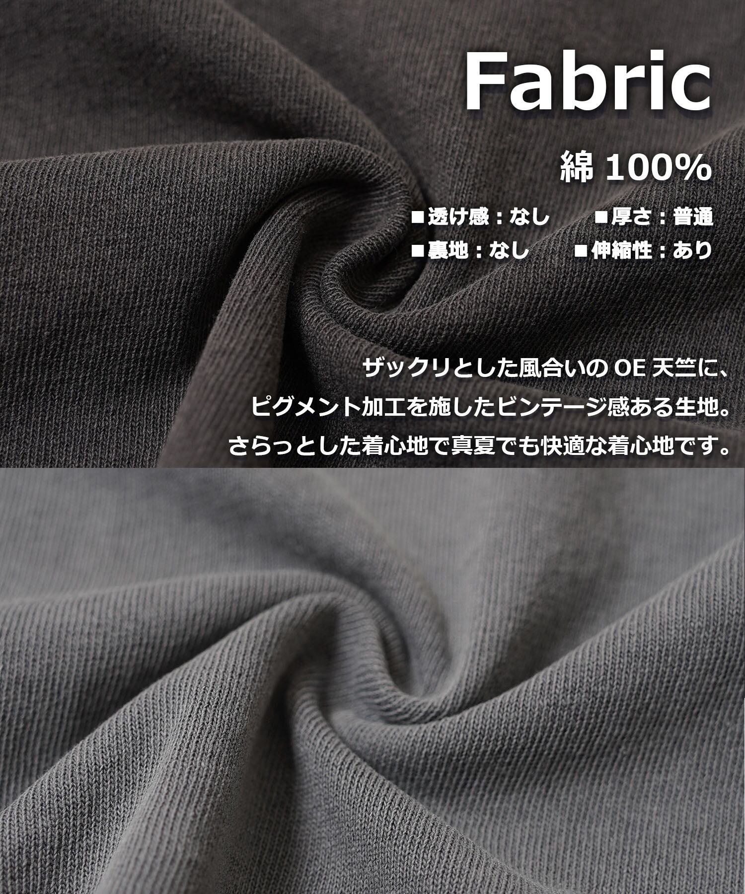 ザックリとした風合いのOE天竺に、ピグメント加工を施したビンテージ感ある生地。さらっとした着心地で真夏でも快適な着心地です。