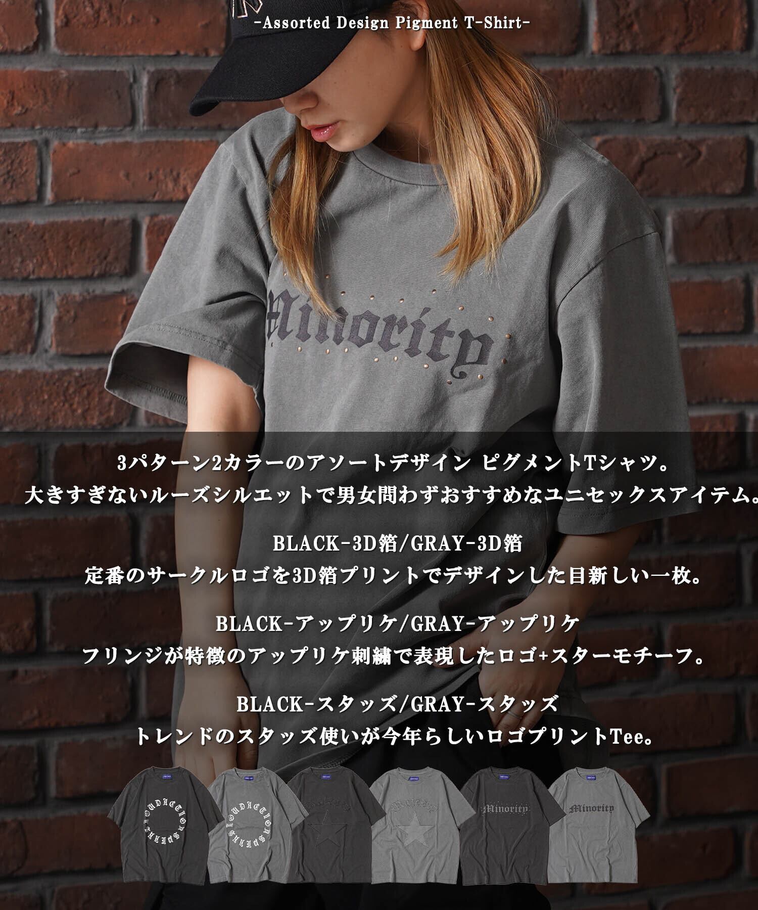 3パターン2カラーのアソートデザイン ピグメントTシャツ。大きすぎないルーズシルエットで男女問わずおすすめなユニセックスアイテム。