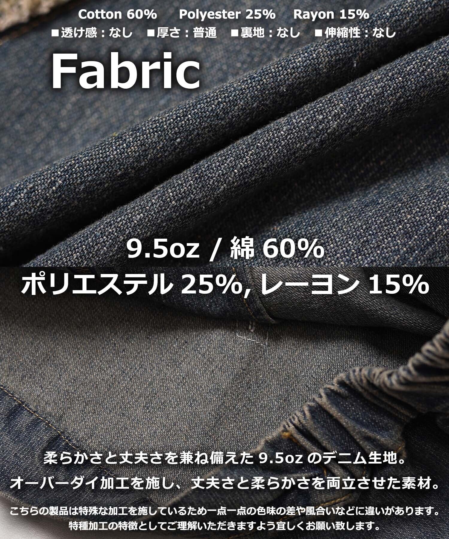 オーバーダイ加工を施し、丈夫さと柔らかさを両立させたデニム素材。