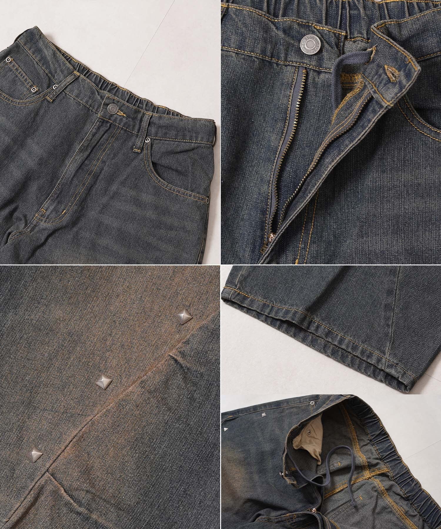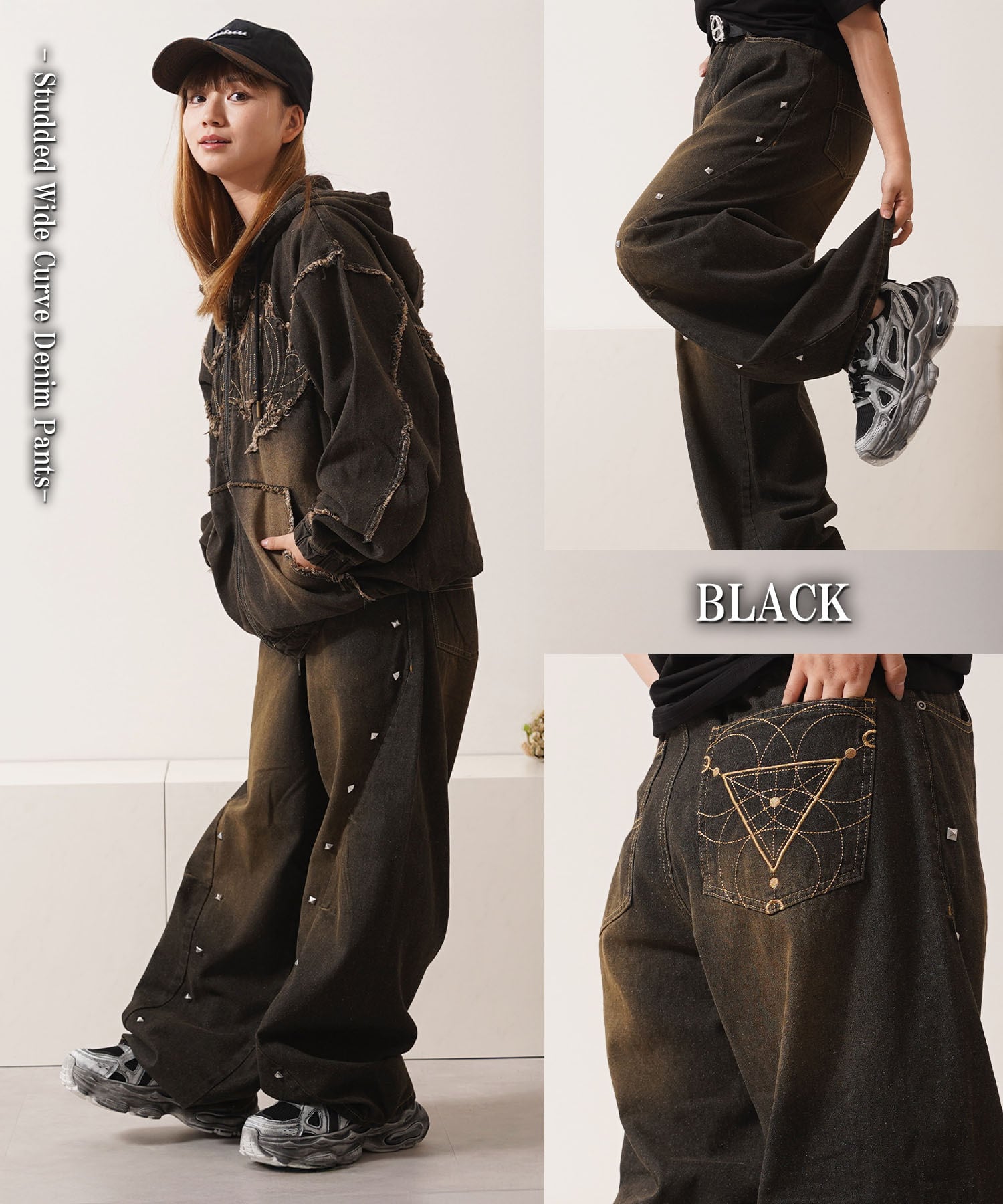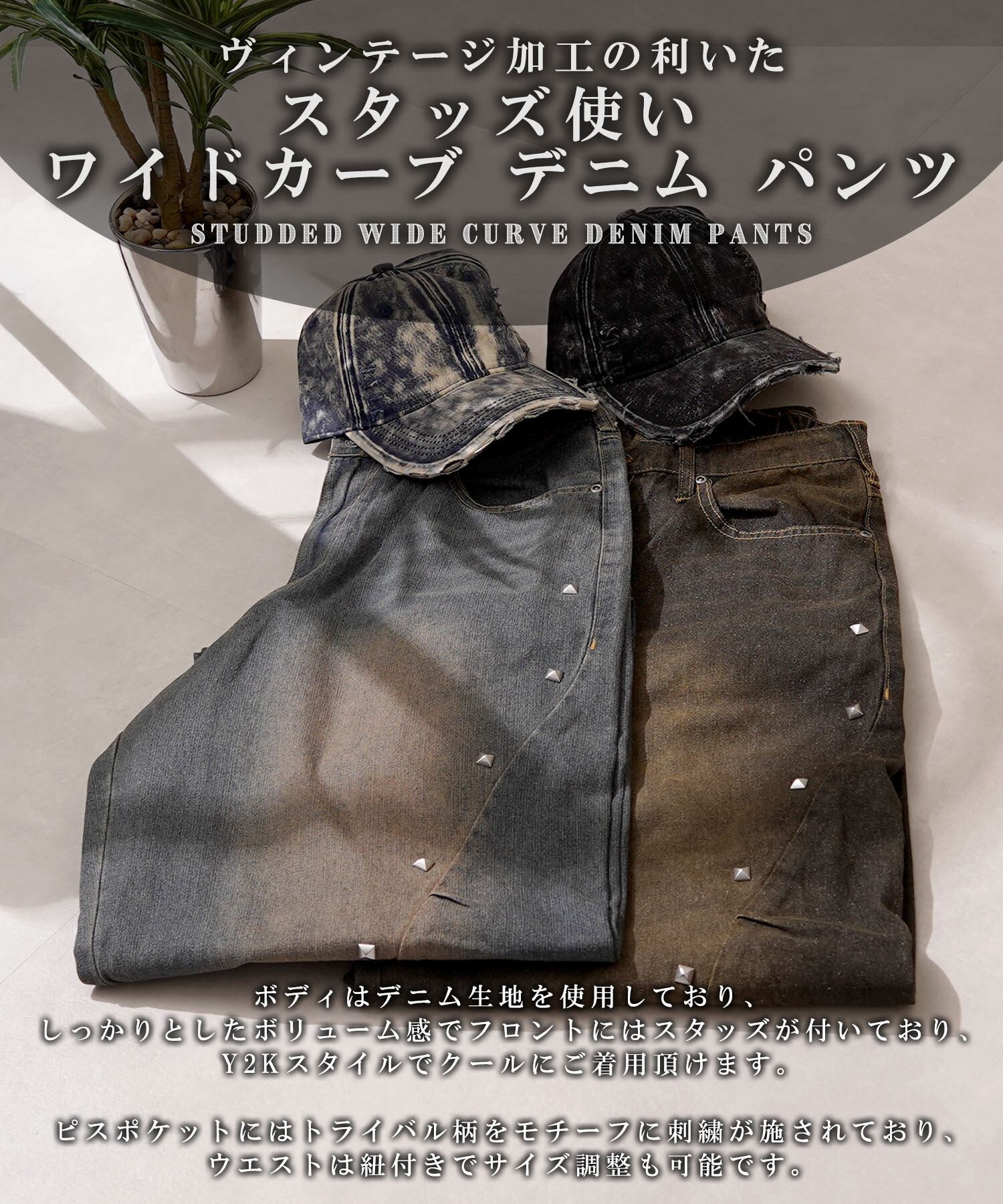 Y2K スタッズ 鋲 飾りボタン ワイドデニム ジーンズ バギーデニム 緩めデニム パンツ ボトム ボトムス 刺繍 トライバル ピスポケット 後ろポケット ヴィンテージ加工 デニム 秋冬 新作 秋服 冬服