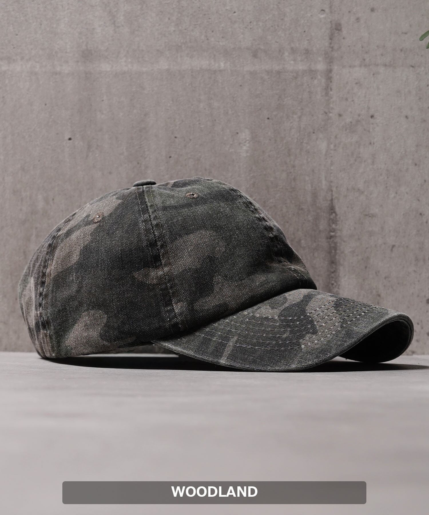 ヴィンテージ加工の効いた迷彩カーブキャップ。
