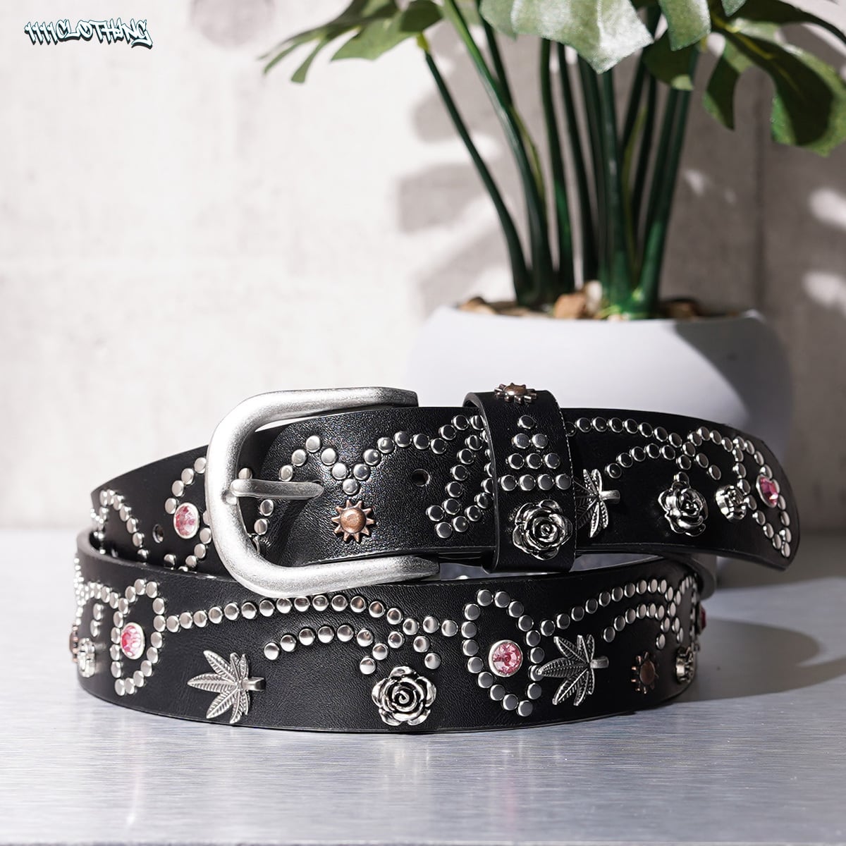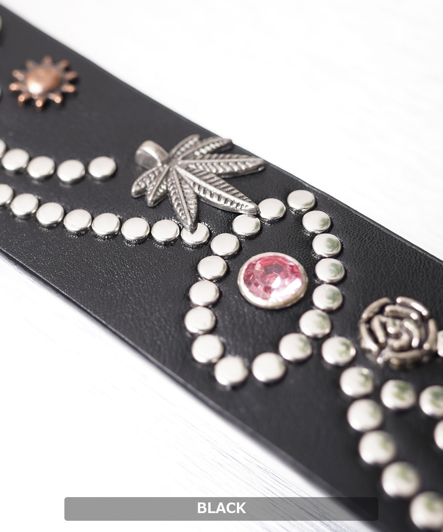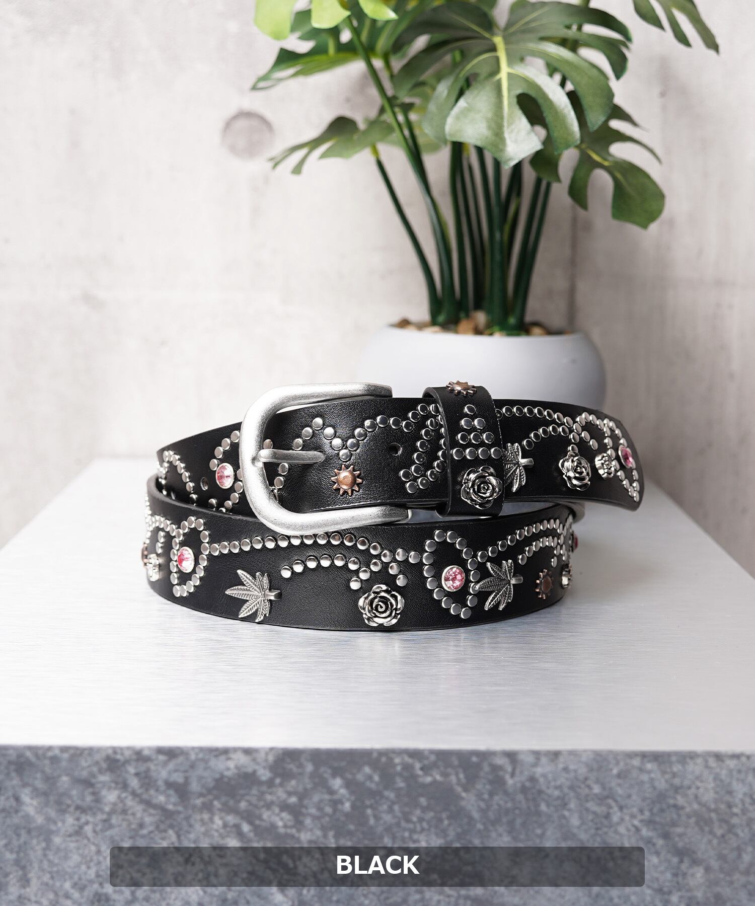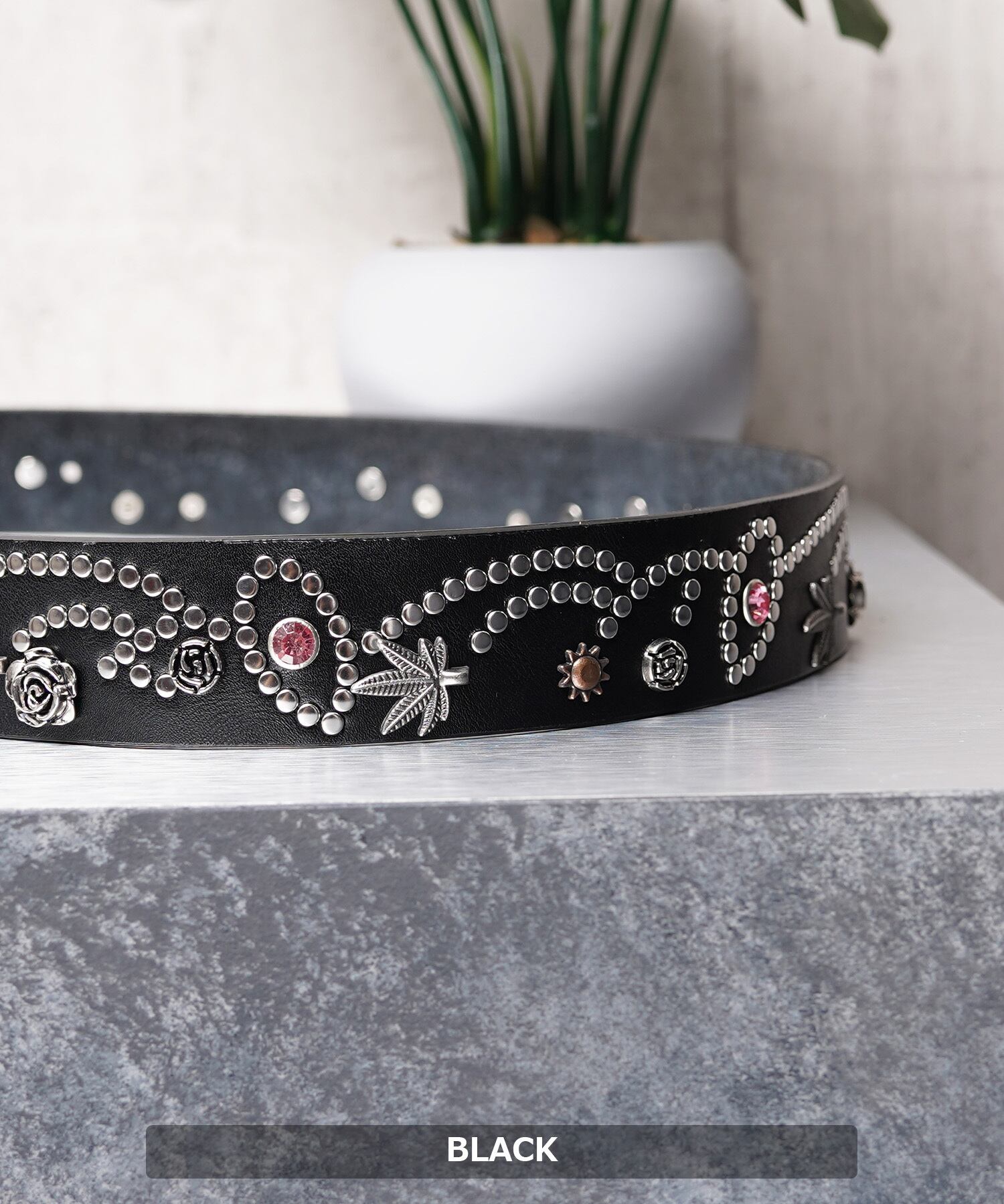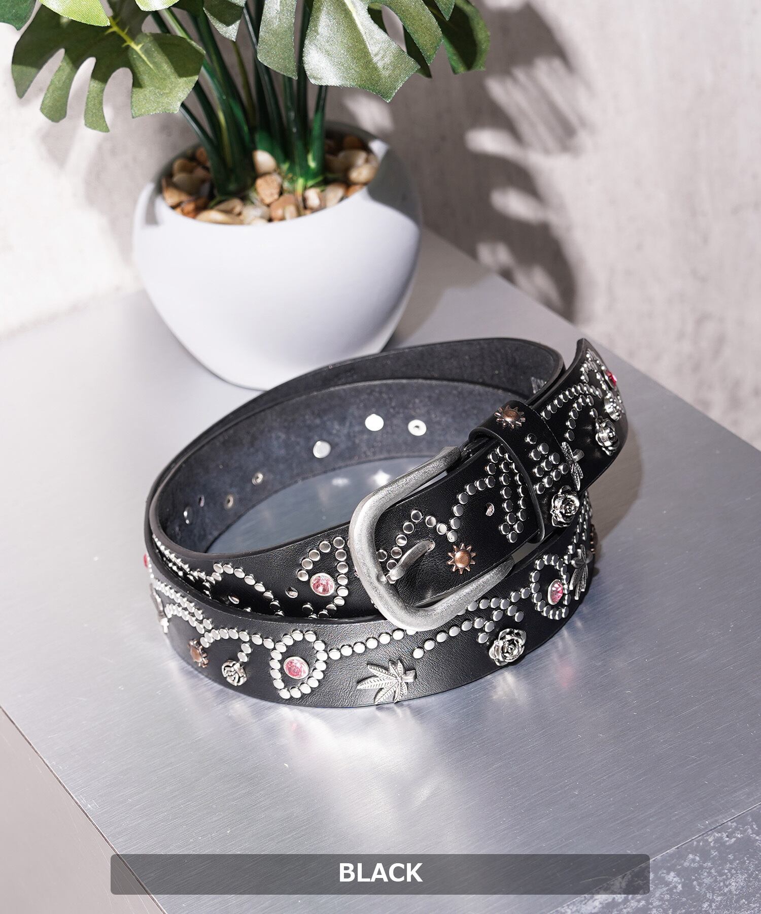 スタッズ ジュエル ジュエリー 装飾 バラ 薔薇 太陽 葉 ベルト 太め フェイクレザー フェイクレザーベルト 帯革 革帯 皮 皮ベルト メンズ レディース 新作