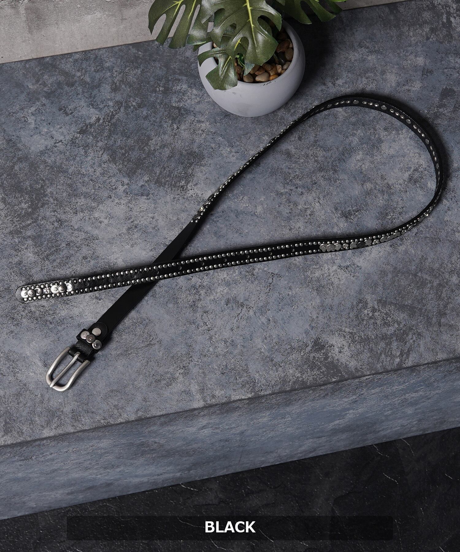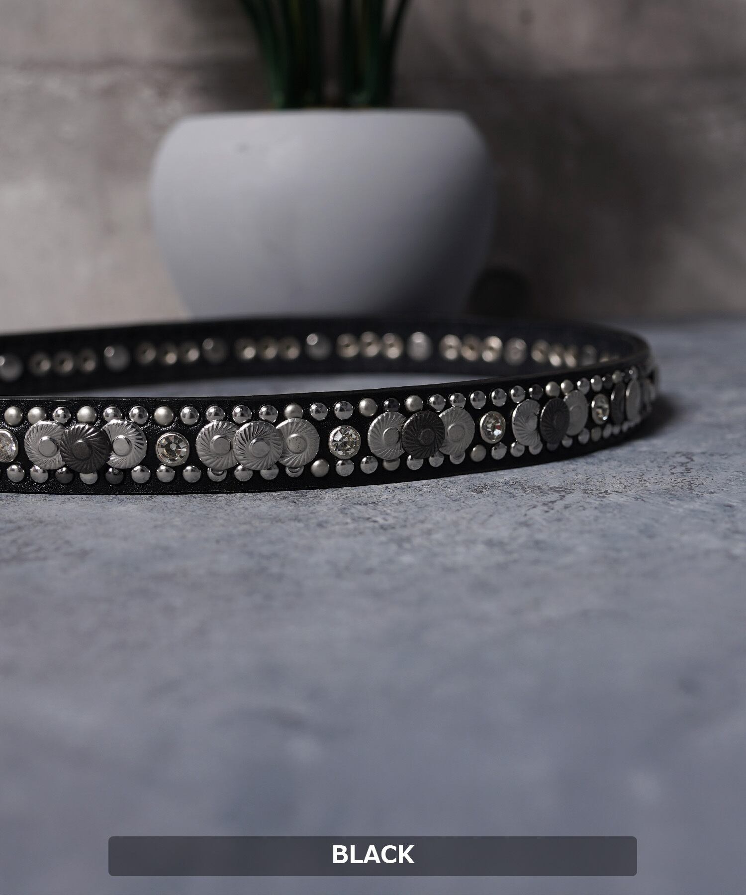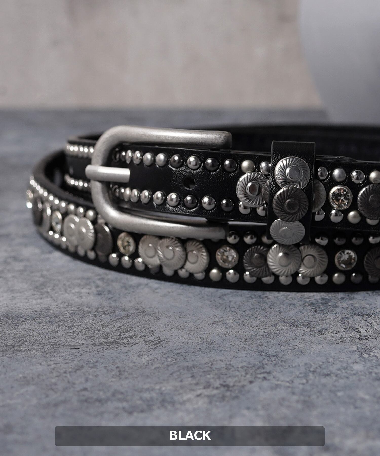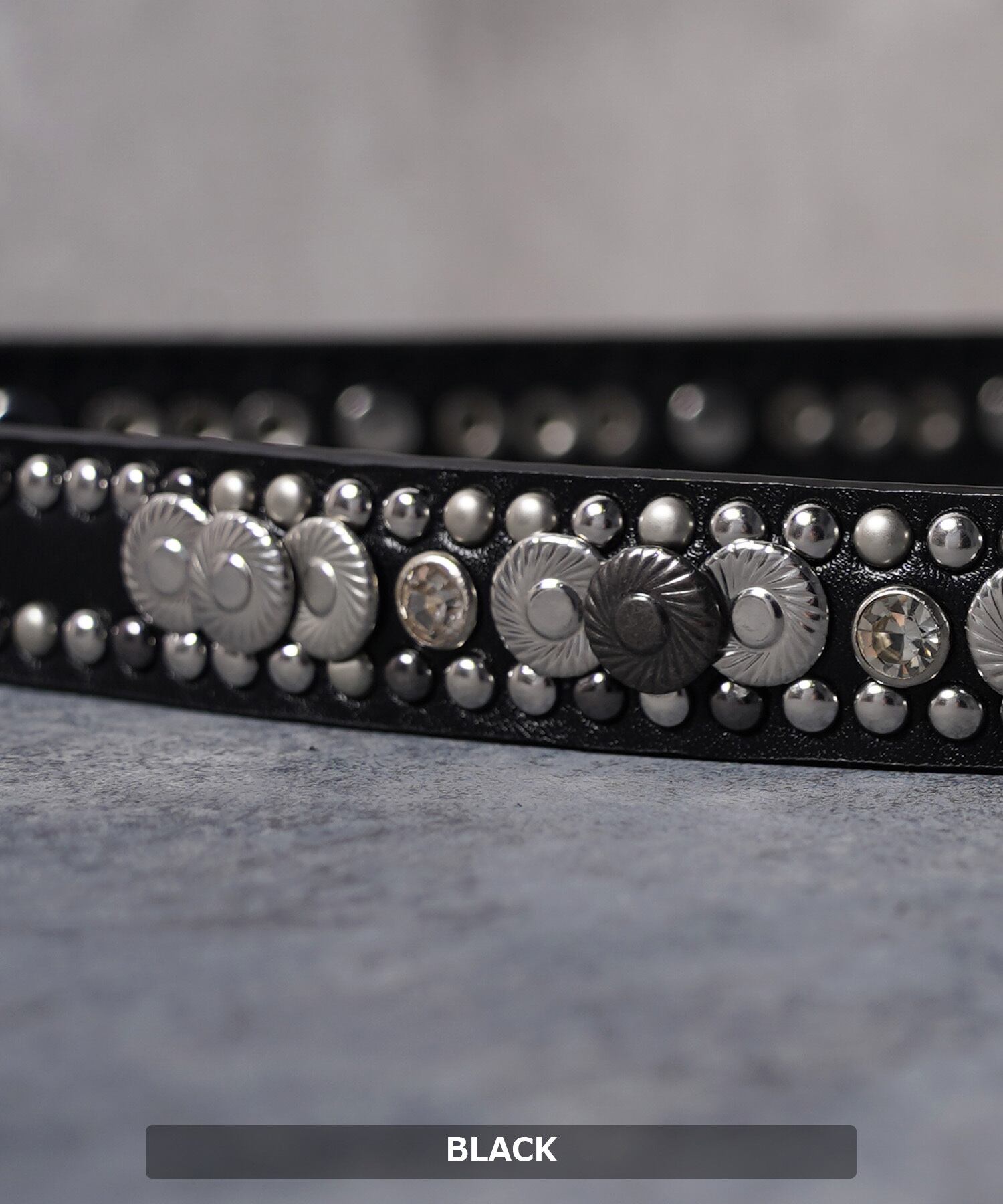小さめのスタッズが周りを縁取りベルトの境界線を引き立て、部分で大きめのフラワースタッズが埋め込まれているデザイン。