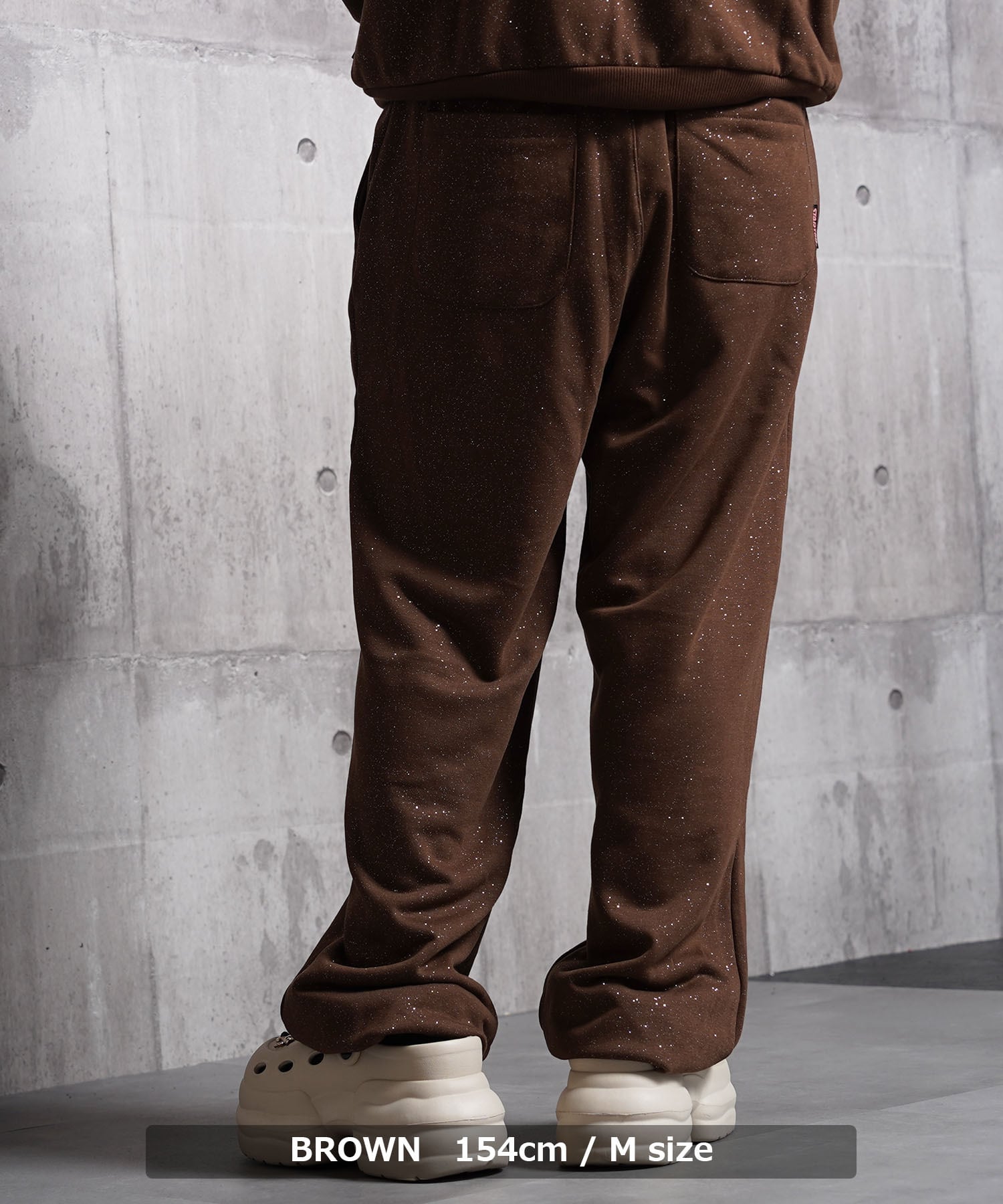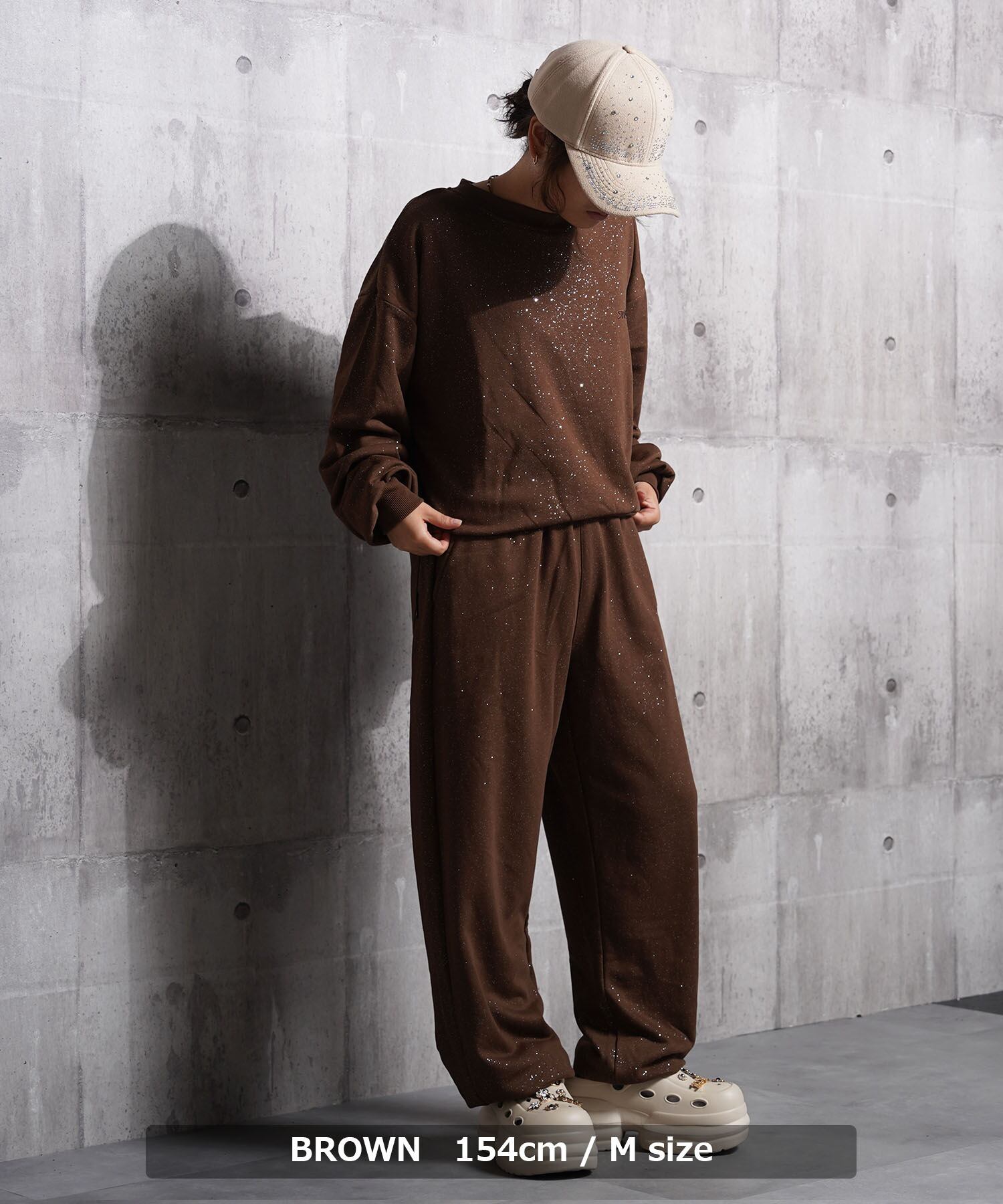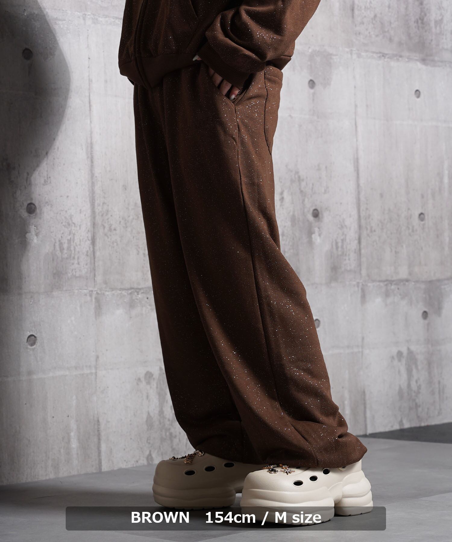グリッターが輝くスウェットパンツで光沢感もあり上品な印象に。