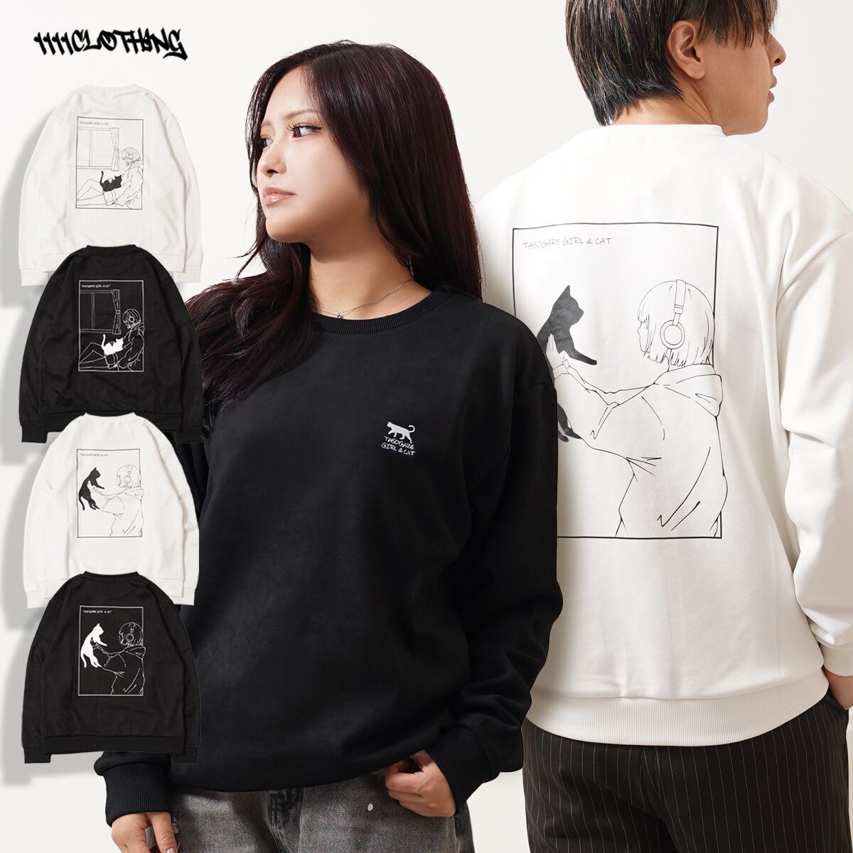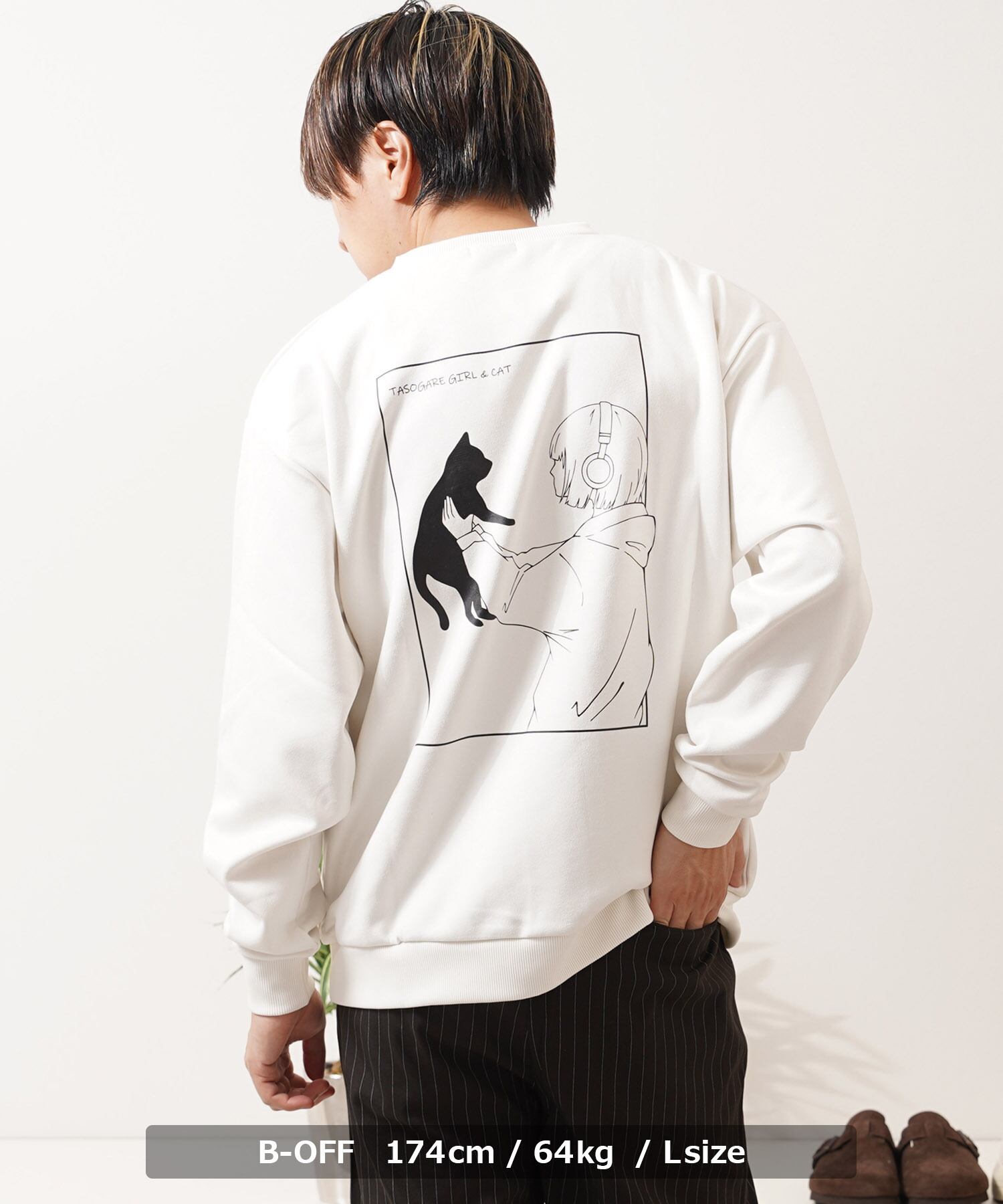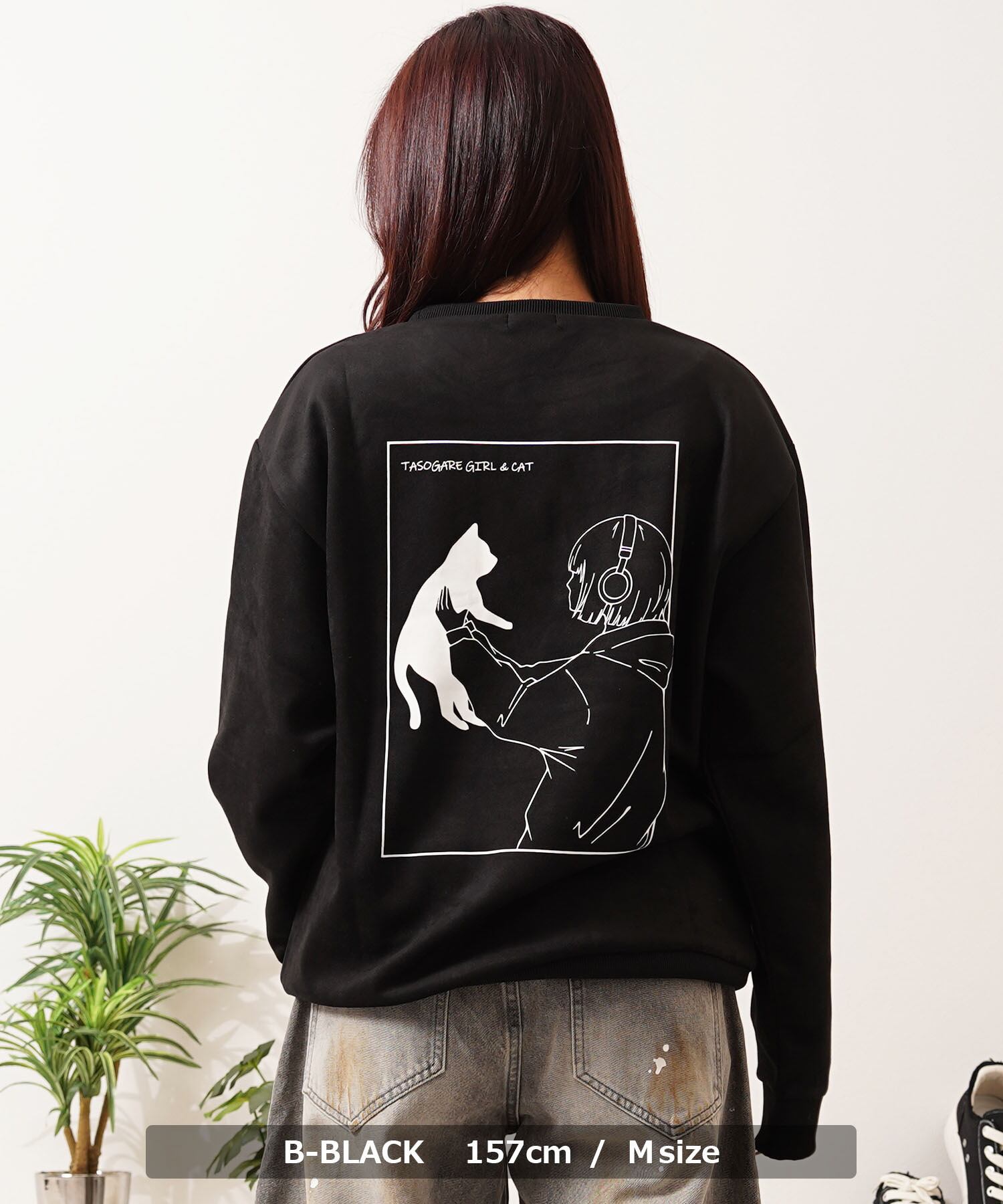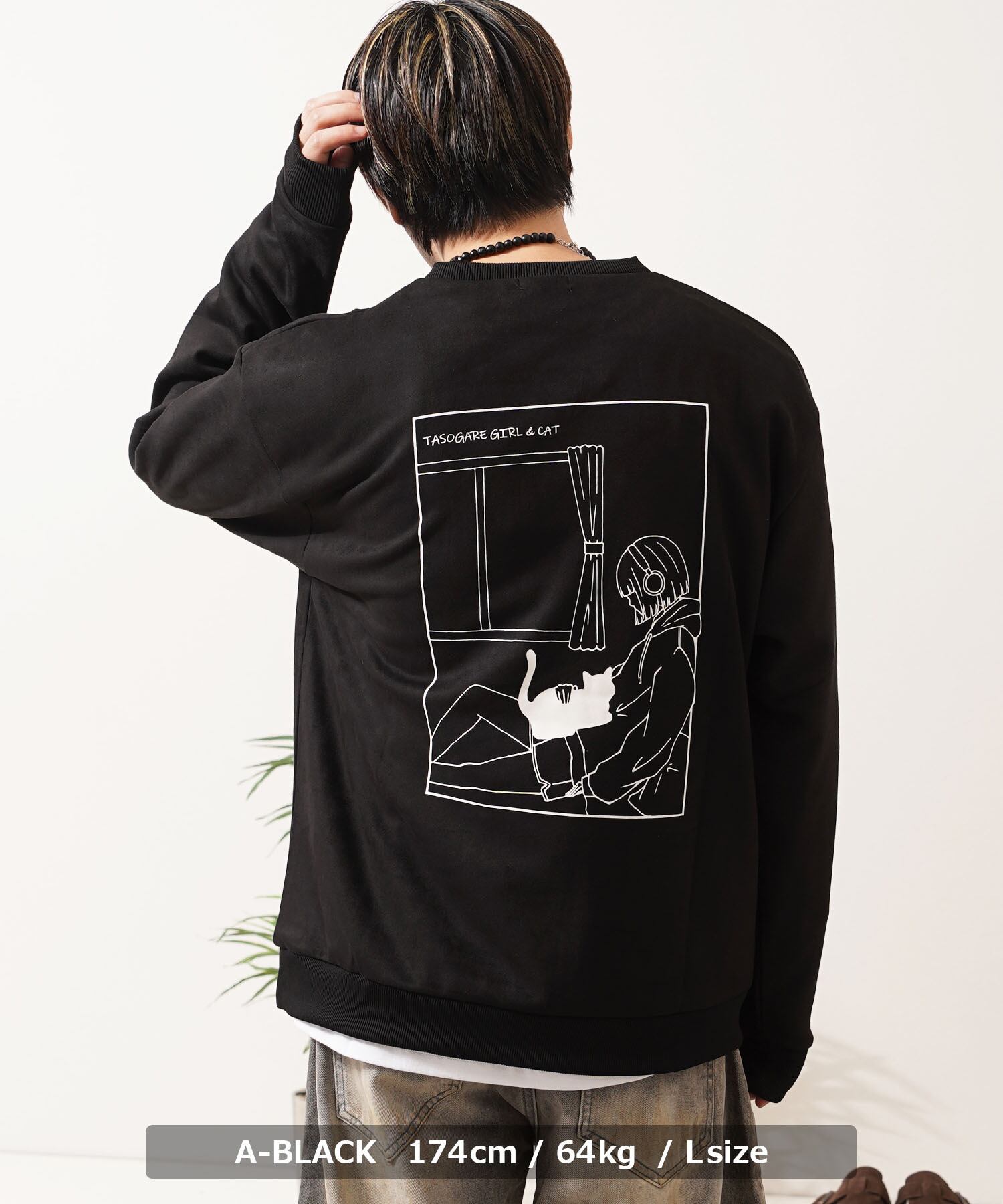 スエード スウェード 少女 女の子 猫?イラスト バックプリント プリント 刺繍 ワンポイント ロゴ LOGO ビッグシルエット スウェット スエット トレーナー 長袖 秋服 冬服 秋 冬 新作 オーバーサイズ