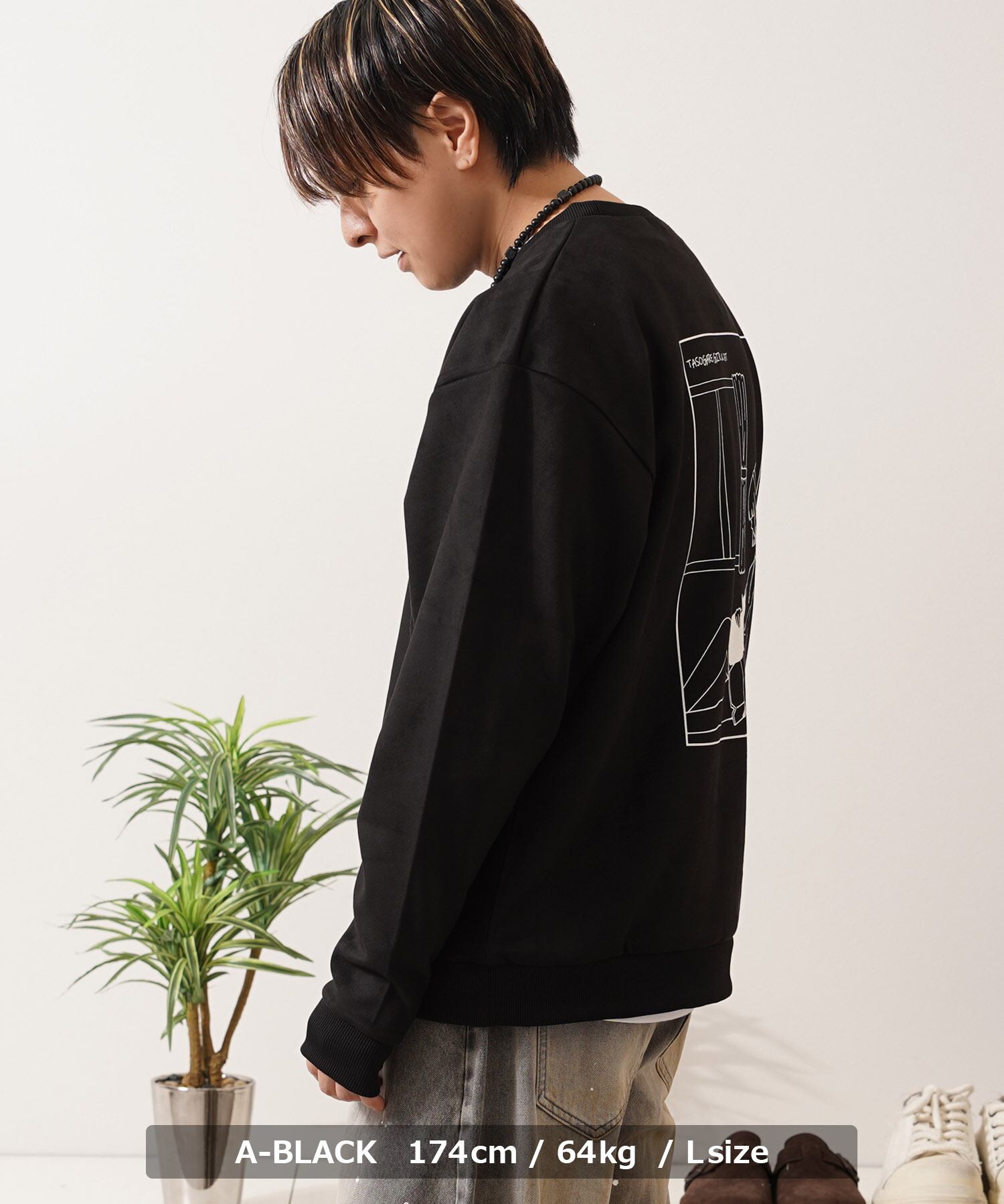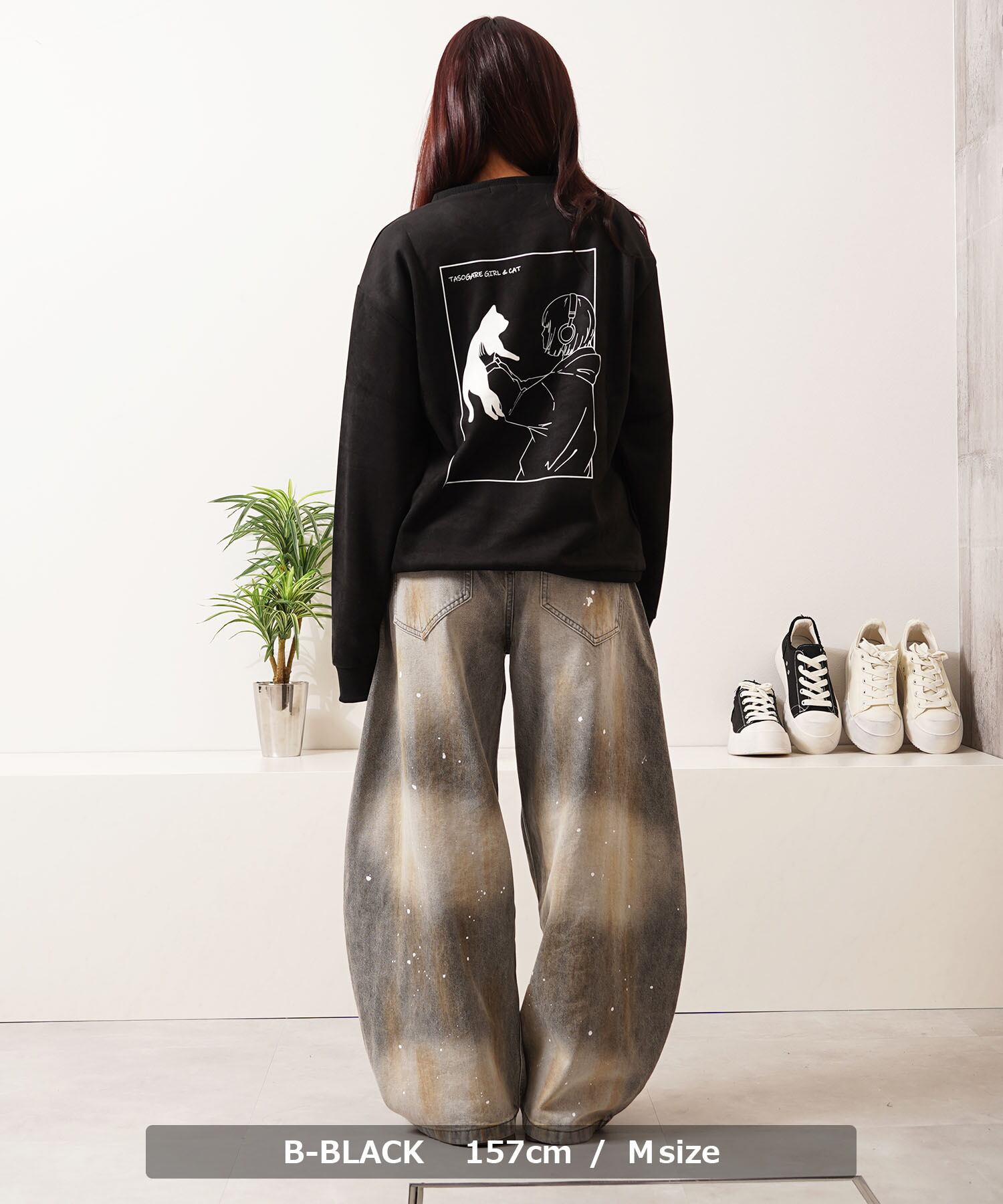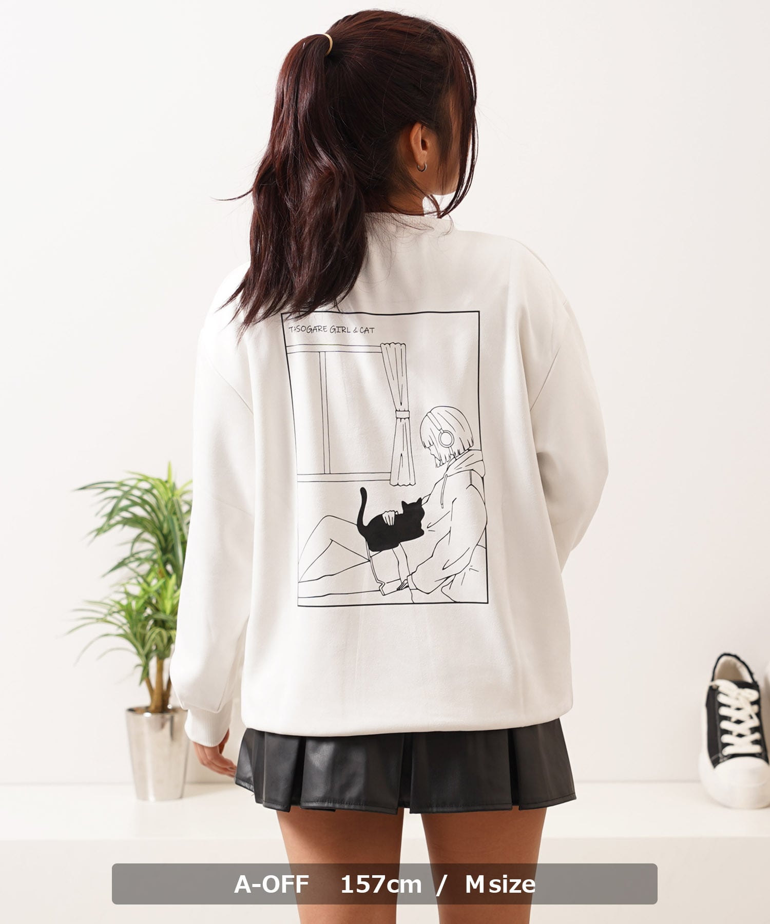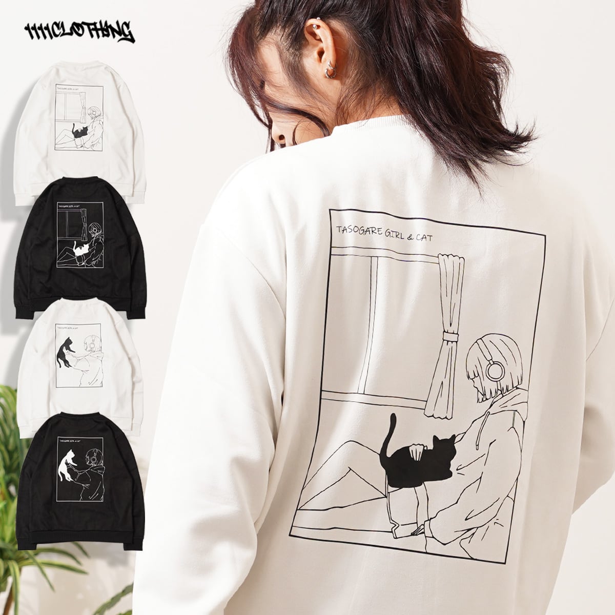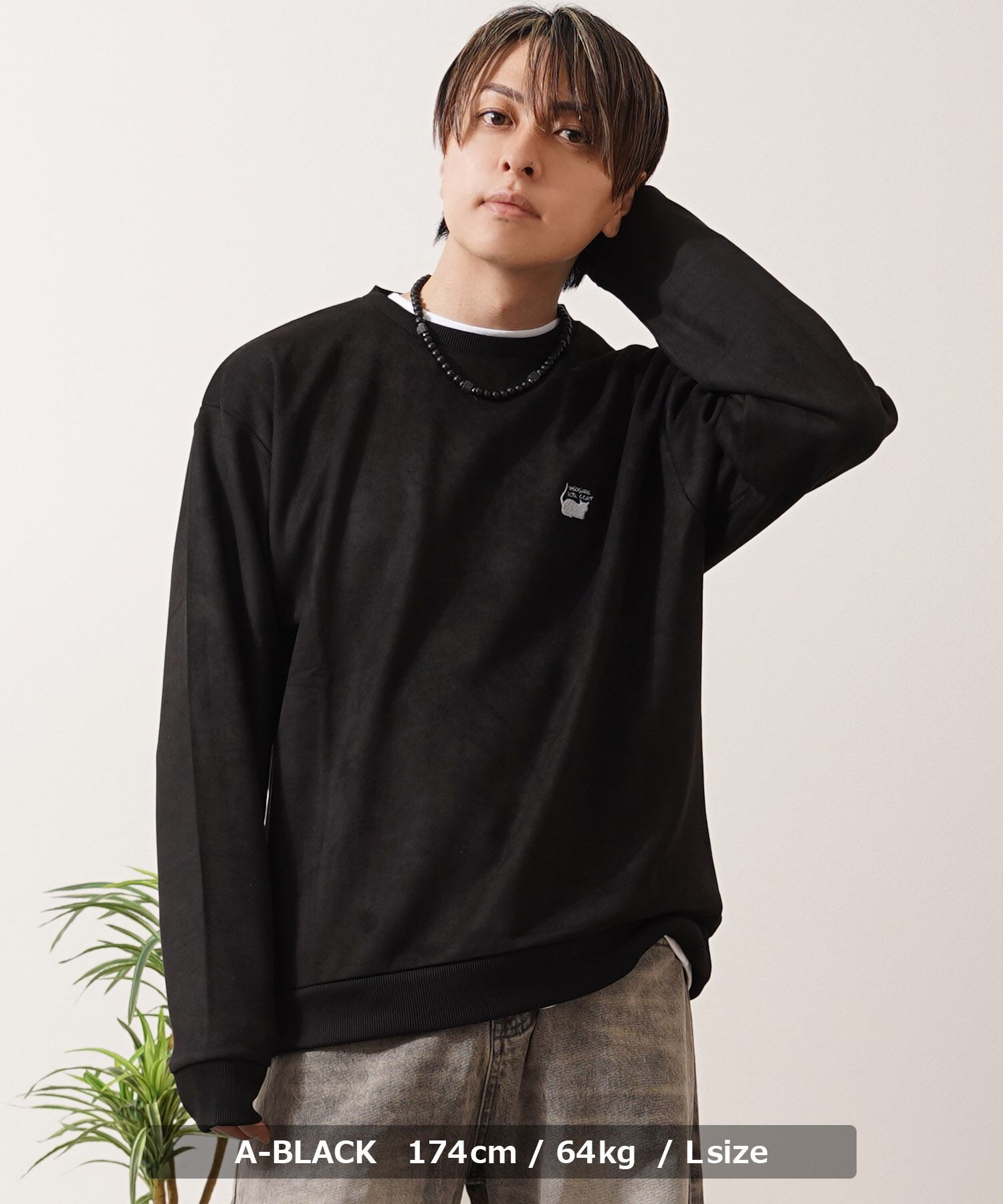 スエード スウェード 少女 女の子 猫?イラスト バックプリント プリント 刺繍 ワンポイント ロゴ LOGO ビッグシルエット スウェット スエット トレーナー 長袖 秋服 冬服 秋 冬 新作 オーバーサイズ