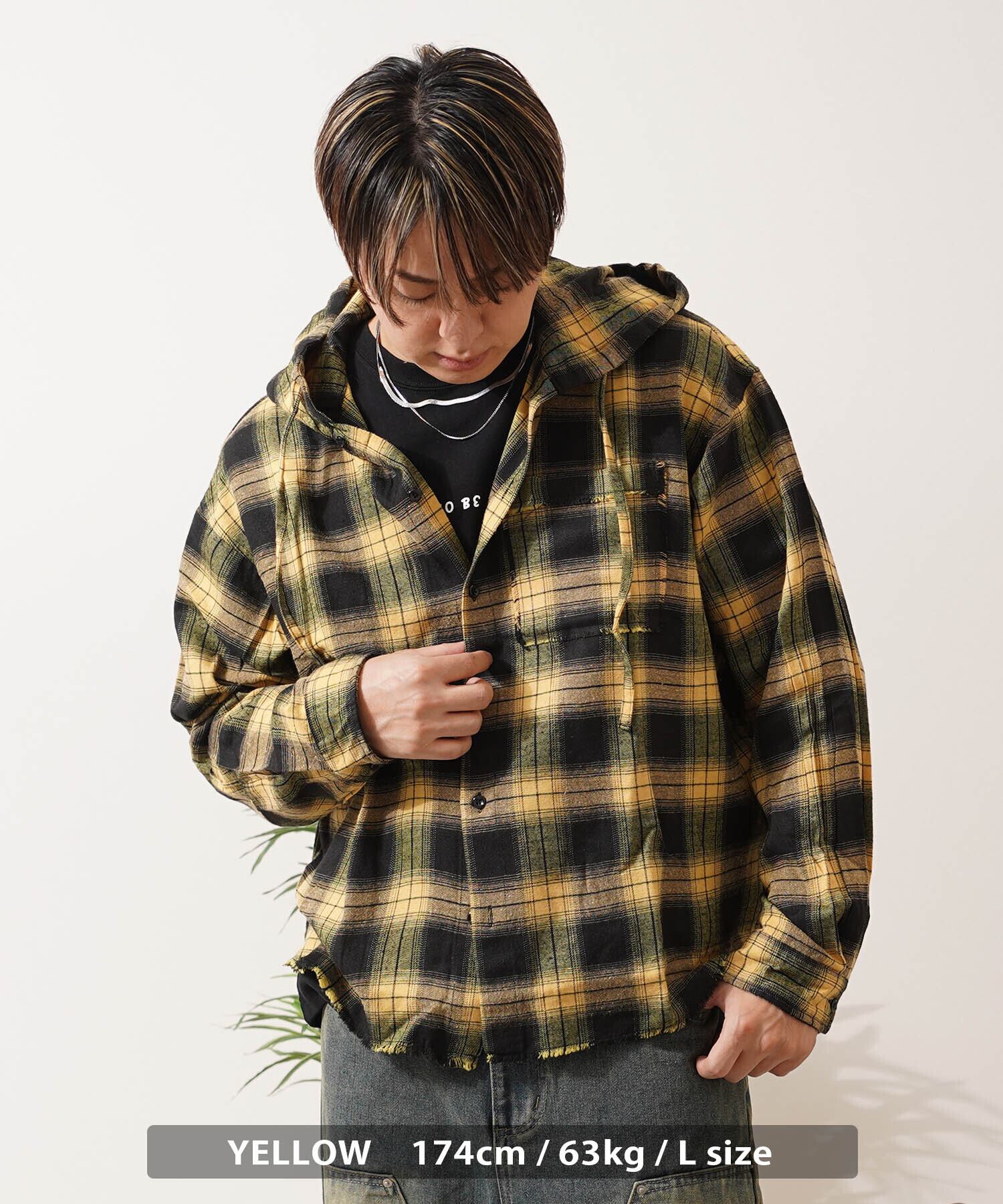 フリンジ加工でフード付きのアクセントが効いたチェック柄シャツパーカー。
