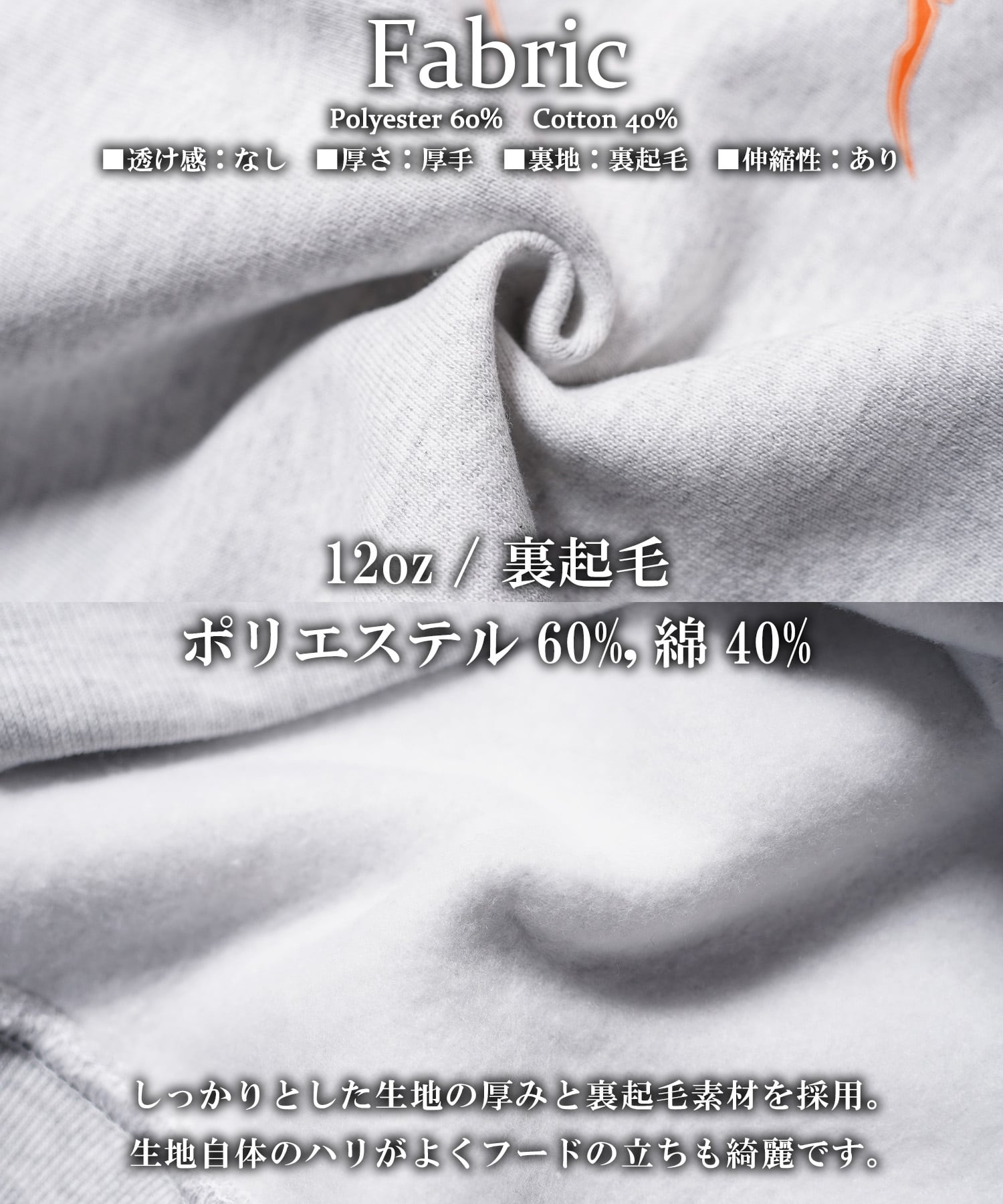 しっかりとした厚手の生地感でフードの立ちも良く、裏起毛で冬場の寒い時期にピッタリの保温性も兼ね備えたアイテム。