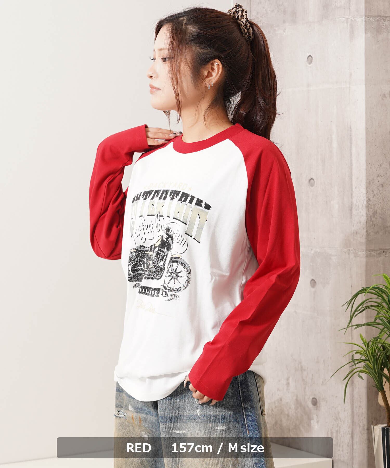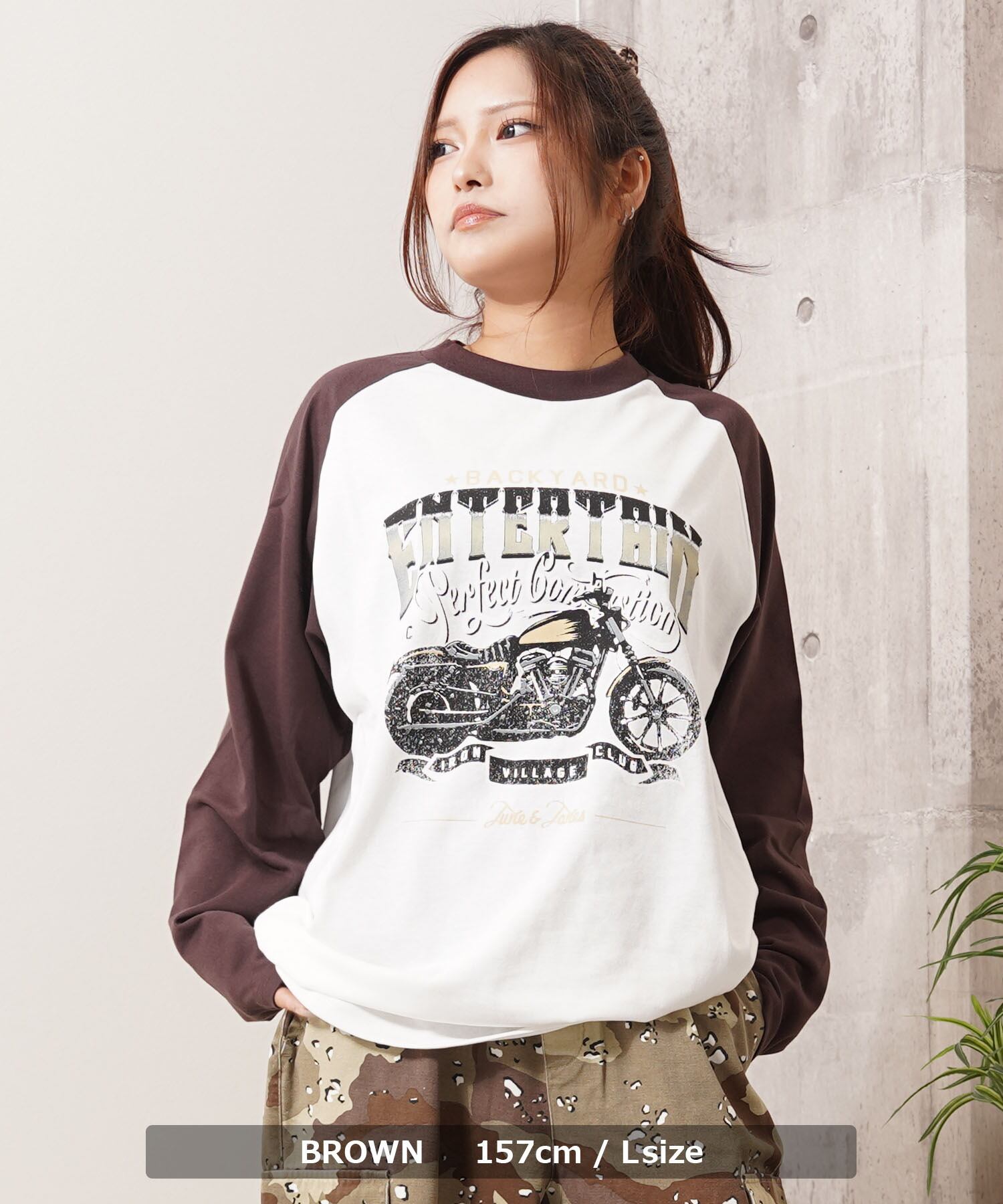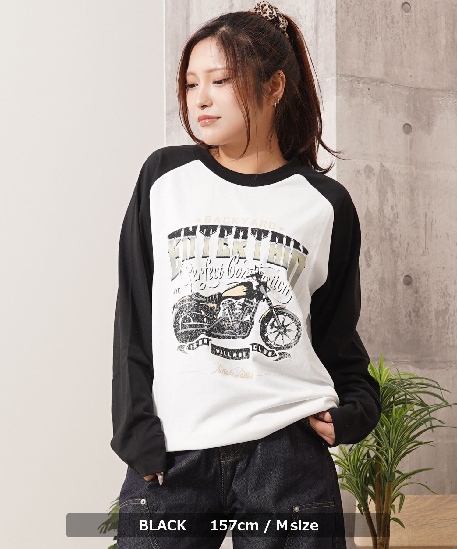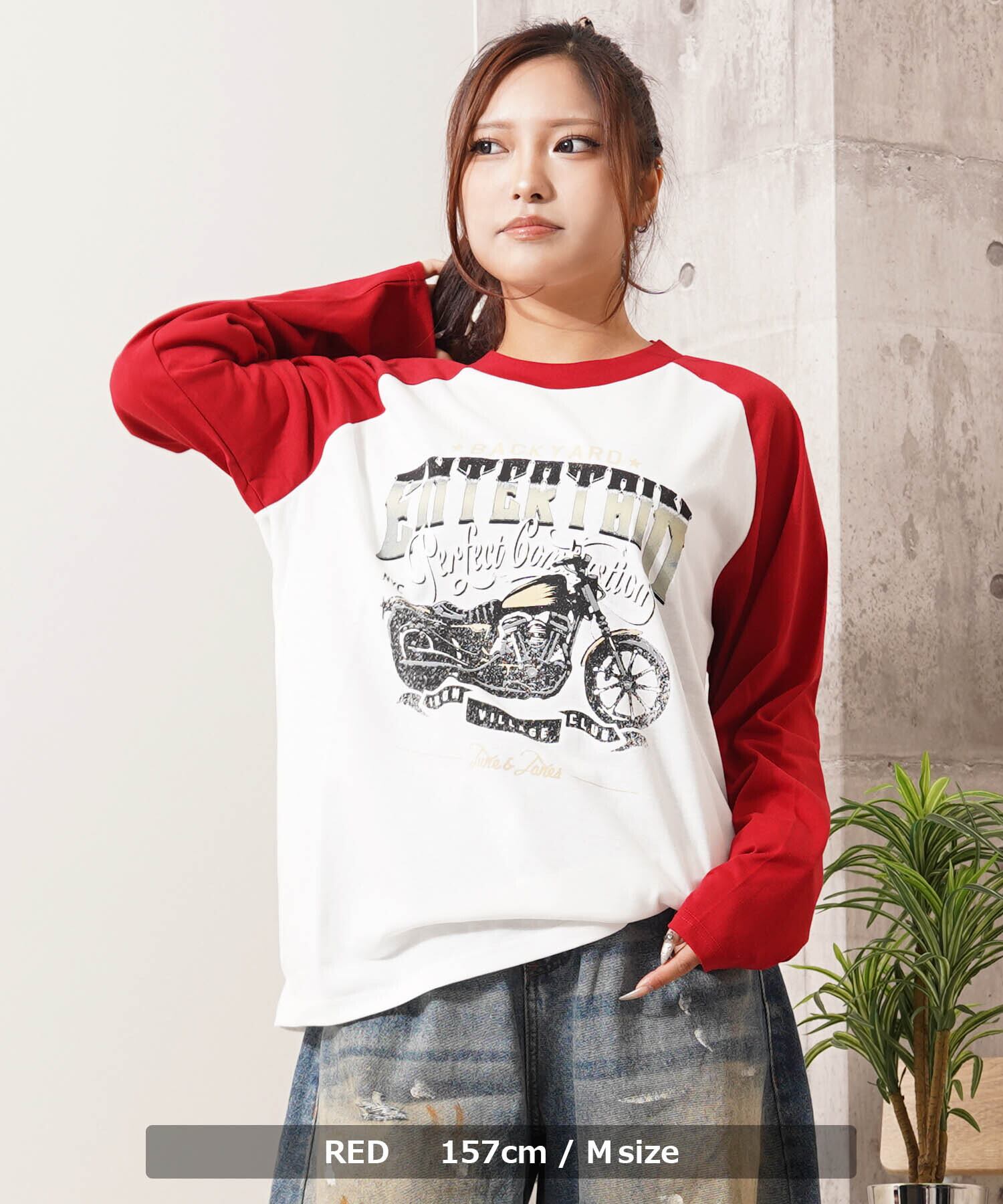 ヴィンテージ加工 プリント イラスト バイク パンク オーバーサイズ ロンT 長袖 クルーネック ドロップショルダー 切替 ヴィンテージ 新作 トレンド トップス