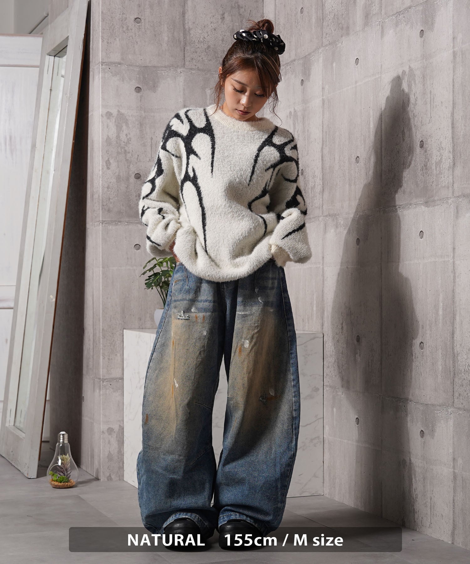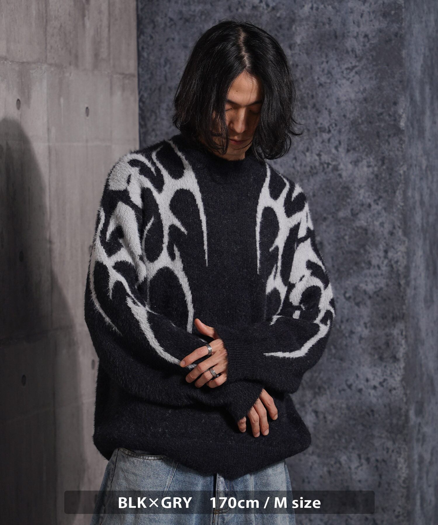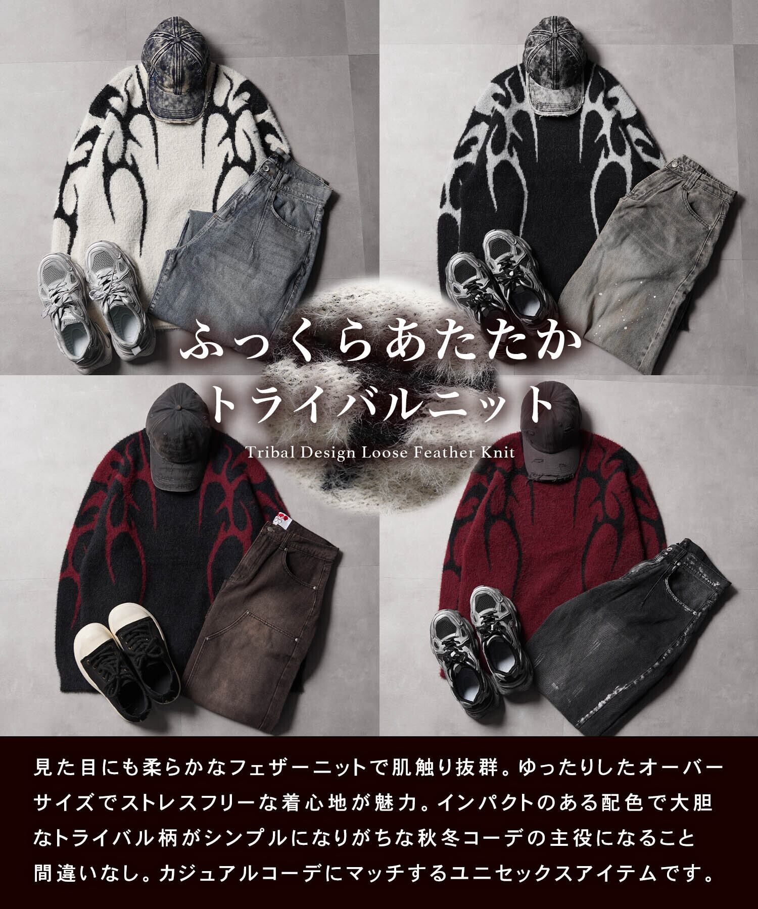 トライバル スクリプト クール モード ニット フェザーニット セーター 長袖 メンズ レディース 新作 トップス トレンド 秋 冬 秋服 冬服 柄 デザインニット オーバーサイズ