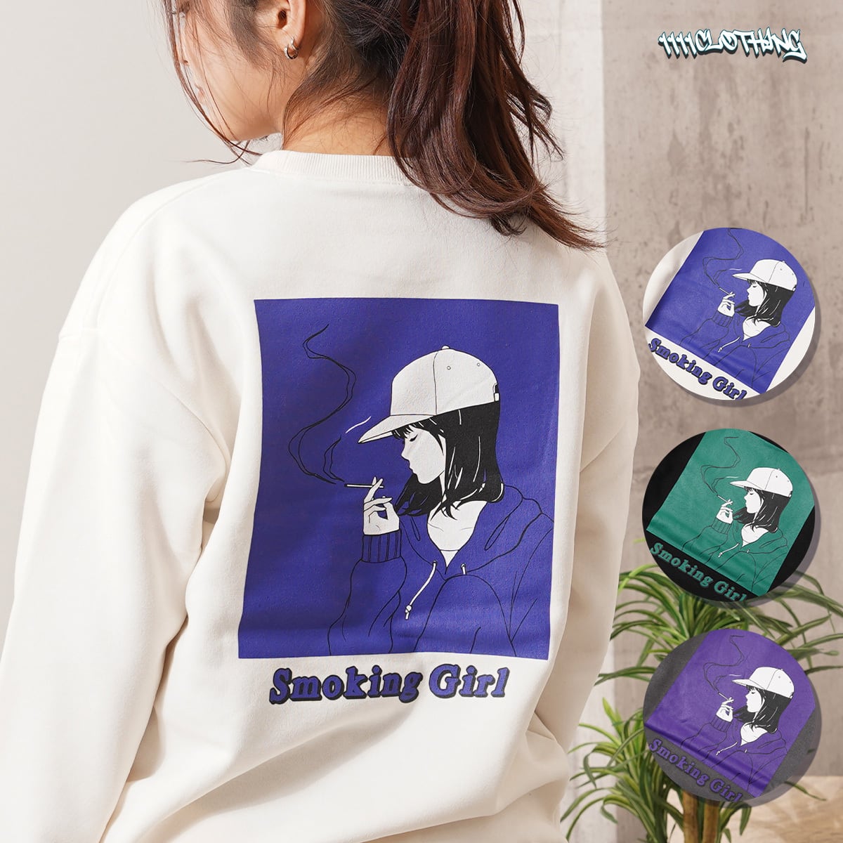 少女 女の子 カジュアル スウェット スエット トレーナー プリント バックプリント ワンポイント タバコ たばこ 煙草 裏起毛 起毛 トップス クルーネック ドロップショルダー 新作 トレンド