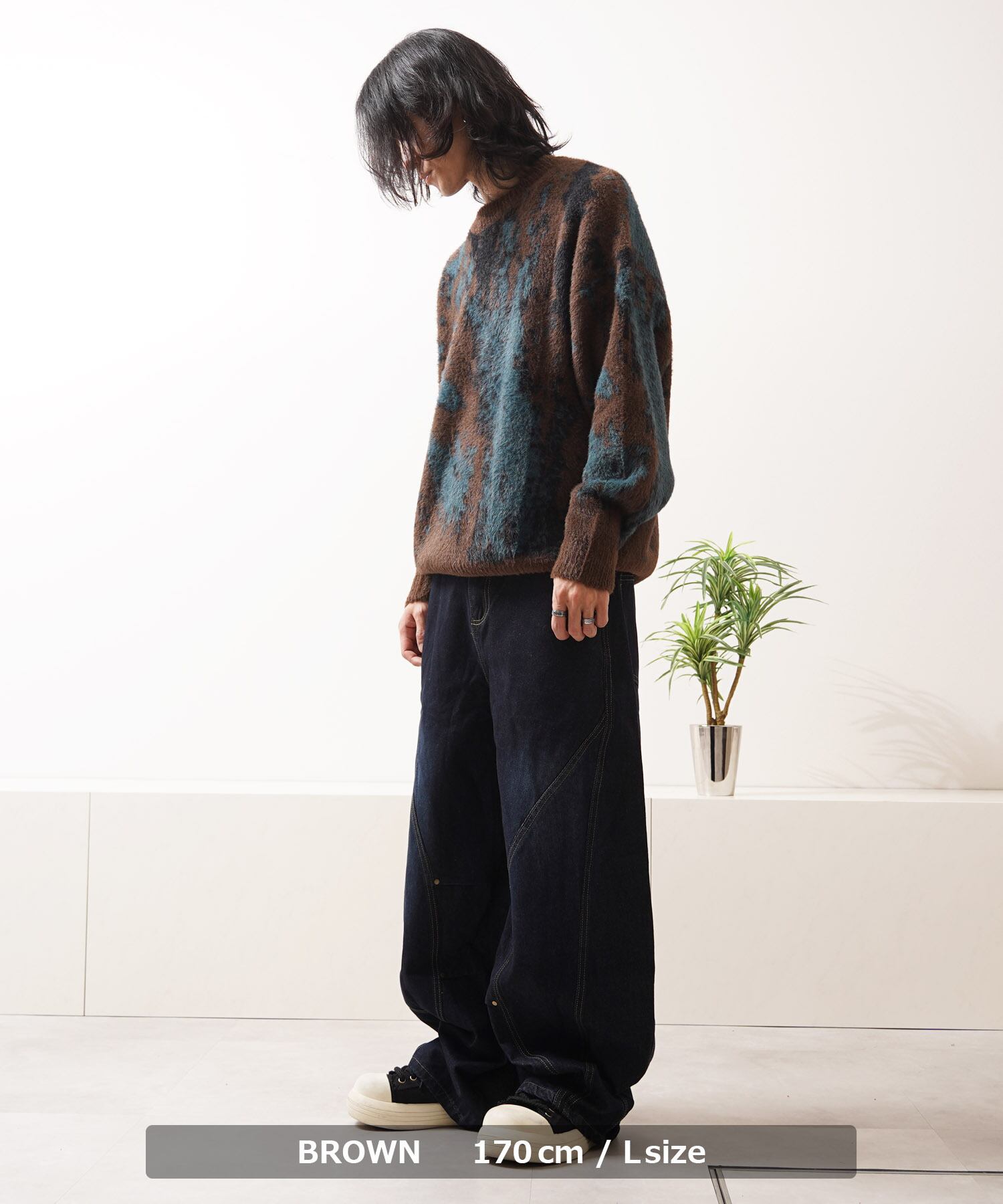ニット セーター カップル 長袖 メンズ レディース トップス オーバーサイズ 総柄 総柄ニット 柄 柄ニット 柄セーター アブストラクト ジャガード ジャギーニット クルーニット 冬 春 冬服 春服 新作 トレンド
