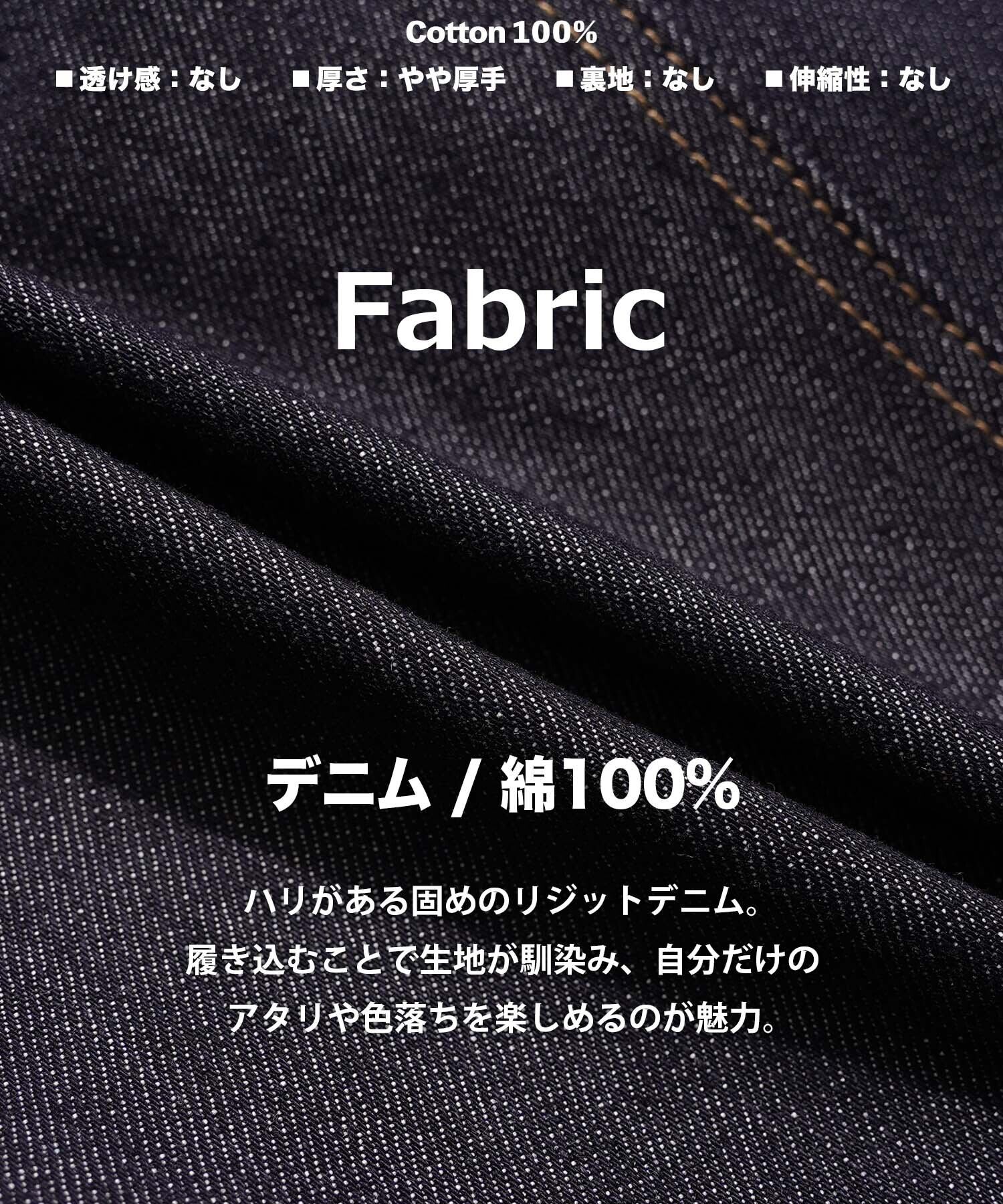 ハリがある固めのリジットデニムで、履き込むことで生地が馴染み、自分だけの「アタリ」や「色落ち」を楽しめるのがポイント。