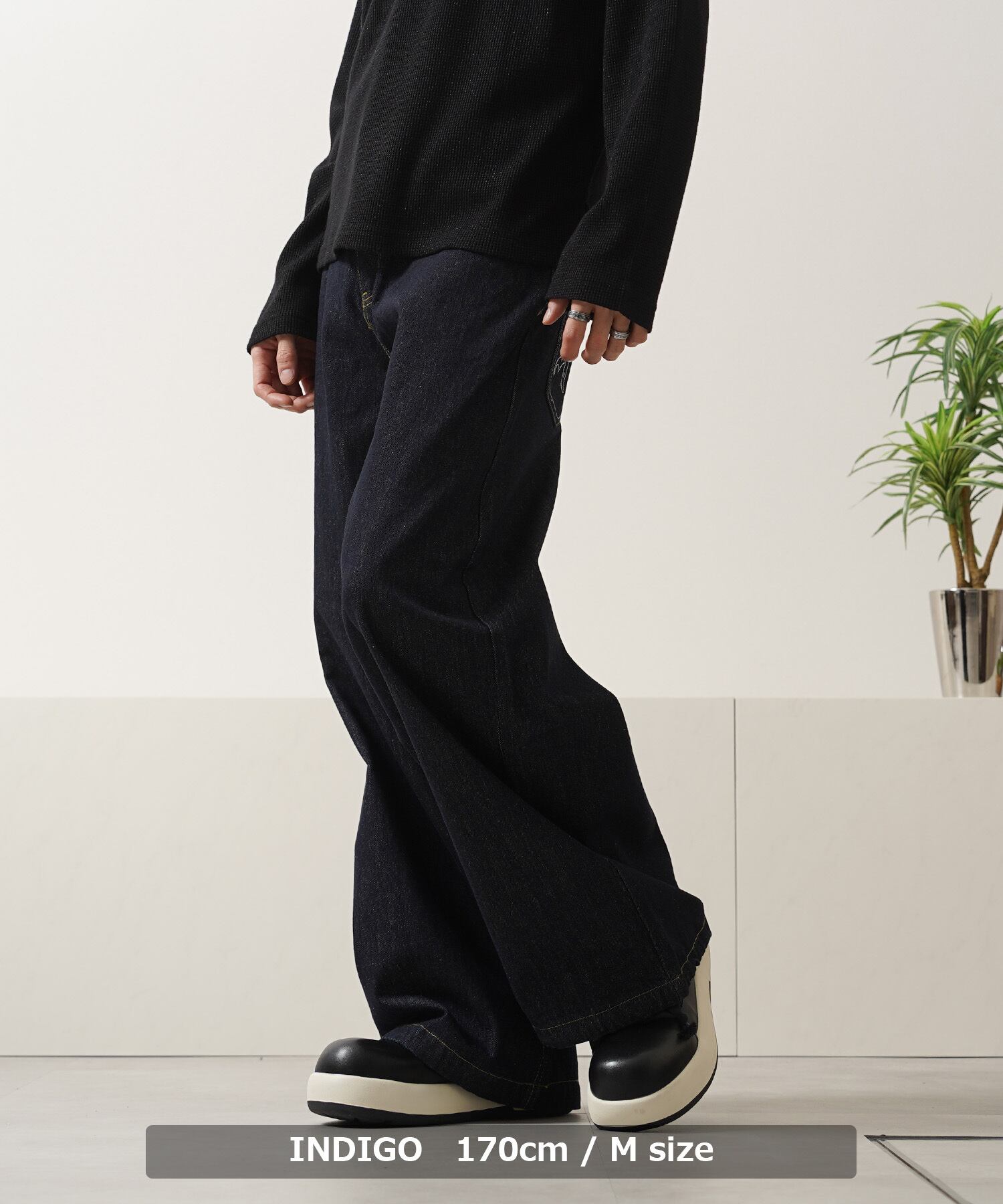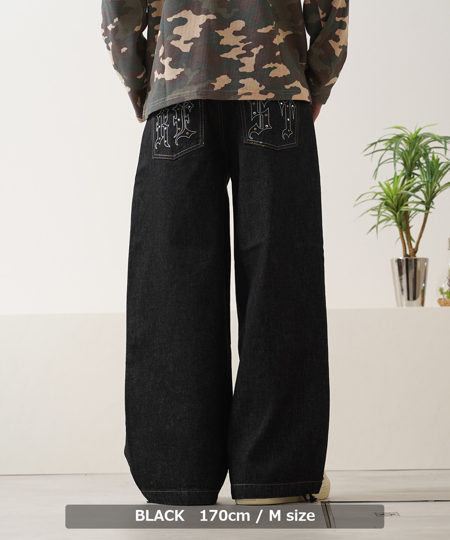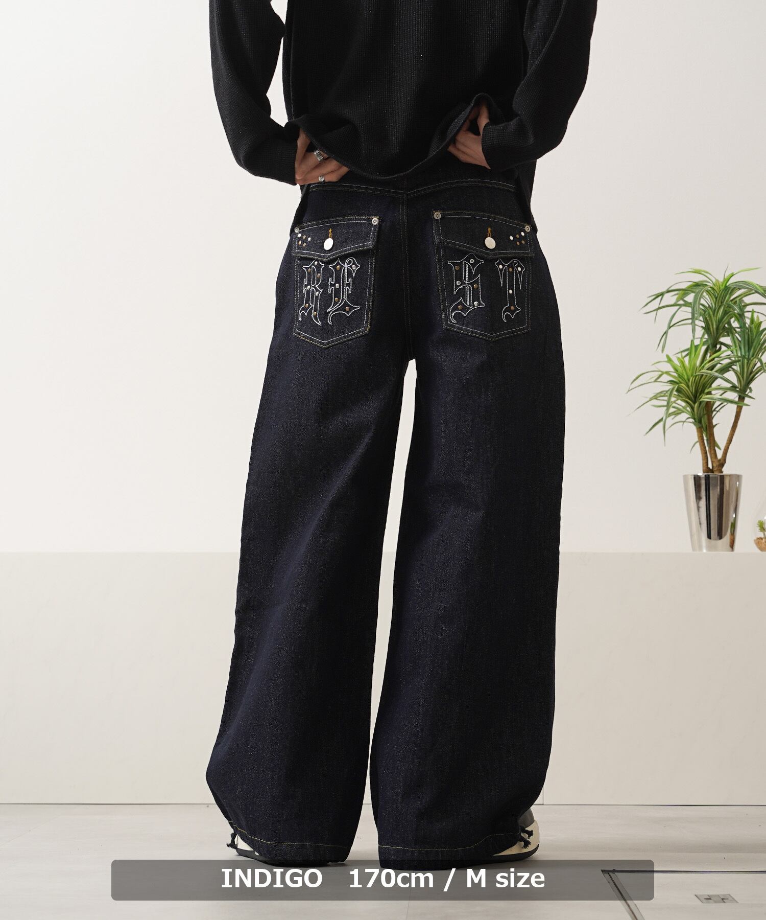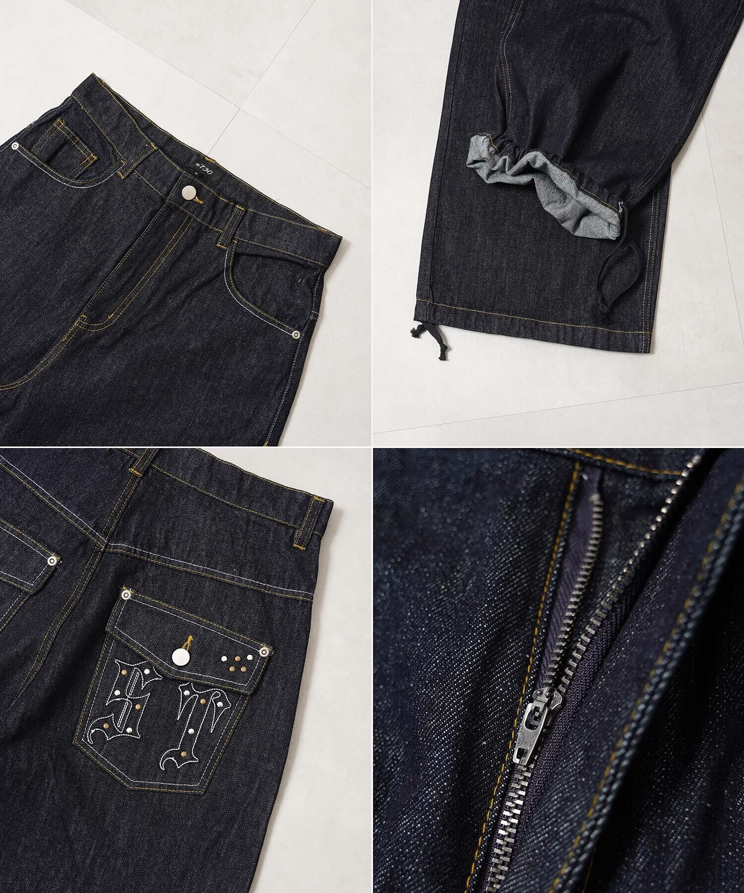リベット スタッズ ビジュー 刺繍 リジット デニム パンツ ワイドデニム ワイドパンツ バギーデニム バギーパンツ ジーンズ 長ズボン ズボン ボトムス メンズ レディース 新作 トレンド