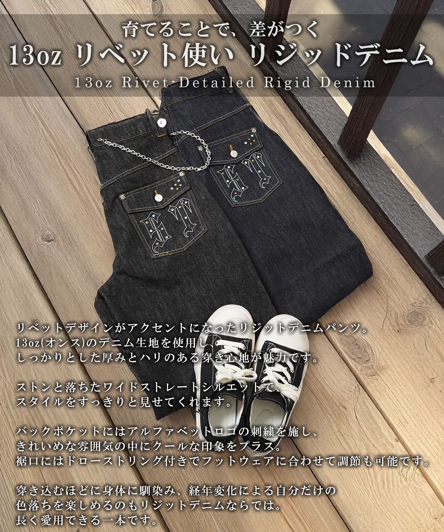 リベットデザインがアクセントになったリジットデニムパンツ。