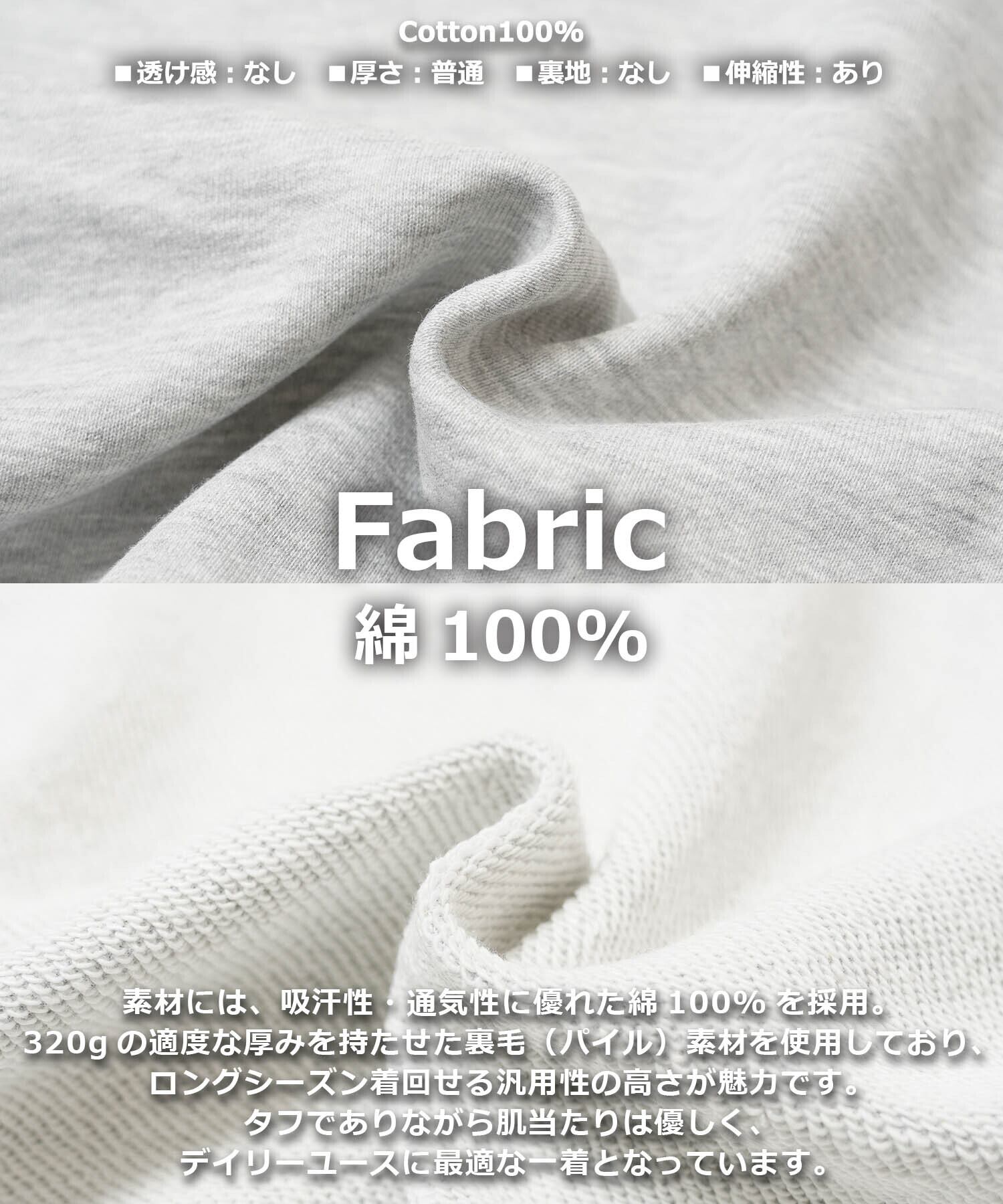 320gの適度な厚みを持たせた裏毛(パイル)素材を使用しており、ロングシーズン着回せる汎用性の高さが魅力です。