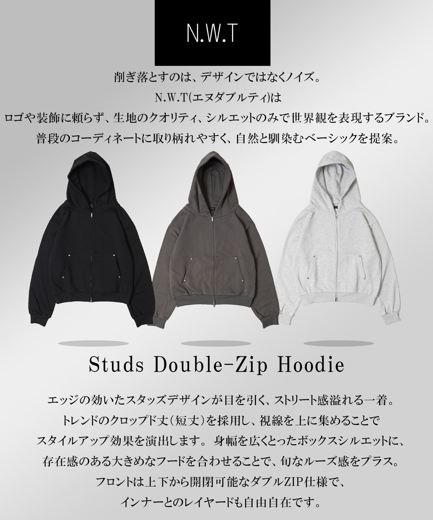スタッズ ダブルZIPパーカー クロップド丈 短丈 綿100% 裏毛 320g セットアップ対応 レディース メンズ ユニセックス スウェット スエット フーディー ボックスシルエット ストリート Y2K カジュアル N.W.T エヌダブルティ 新作 トレンド 春 春服 秋 秋服
