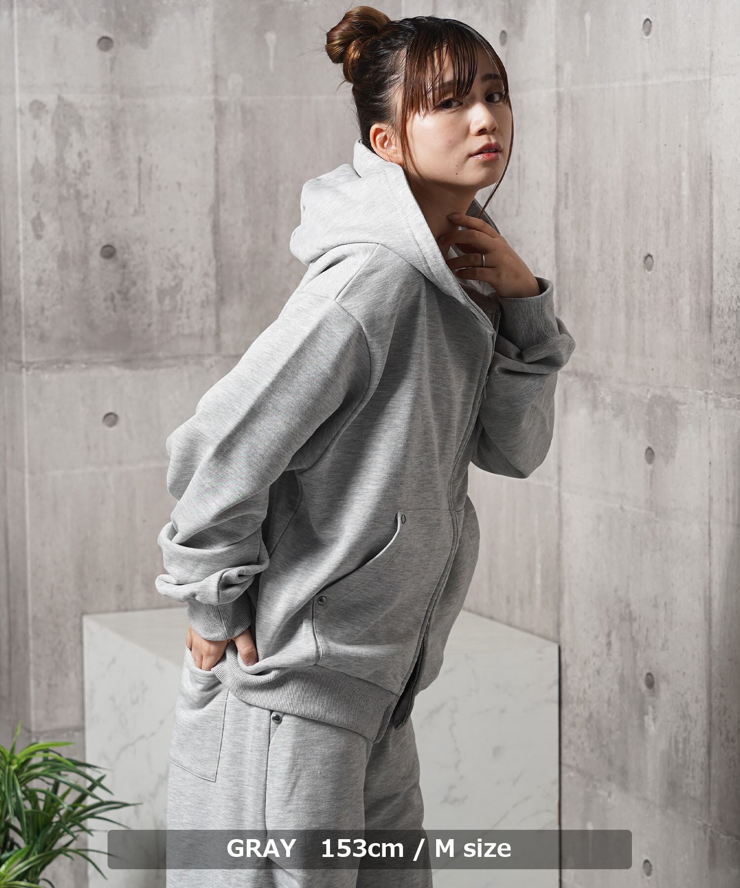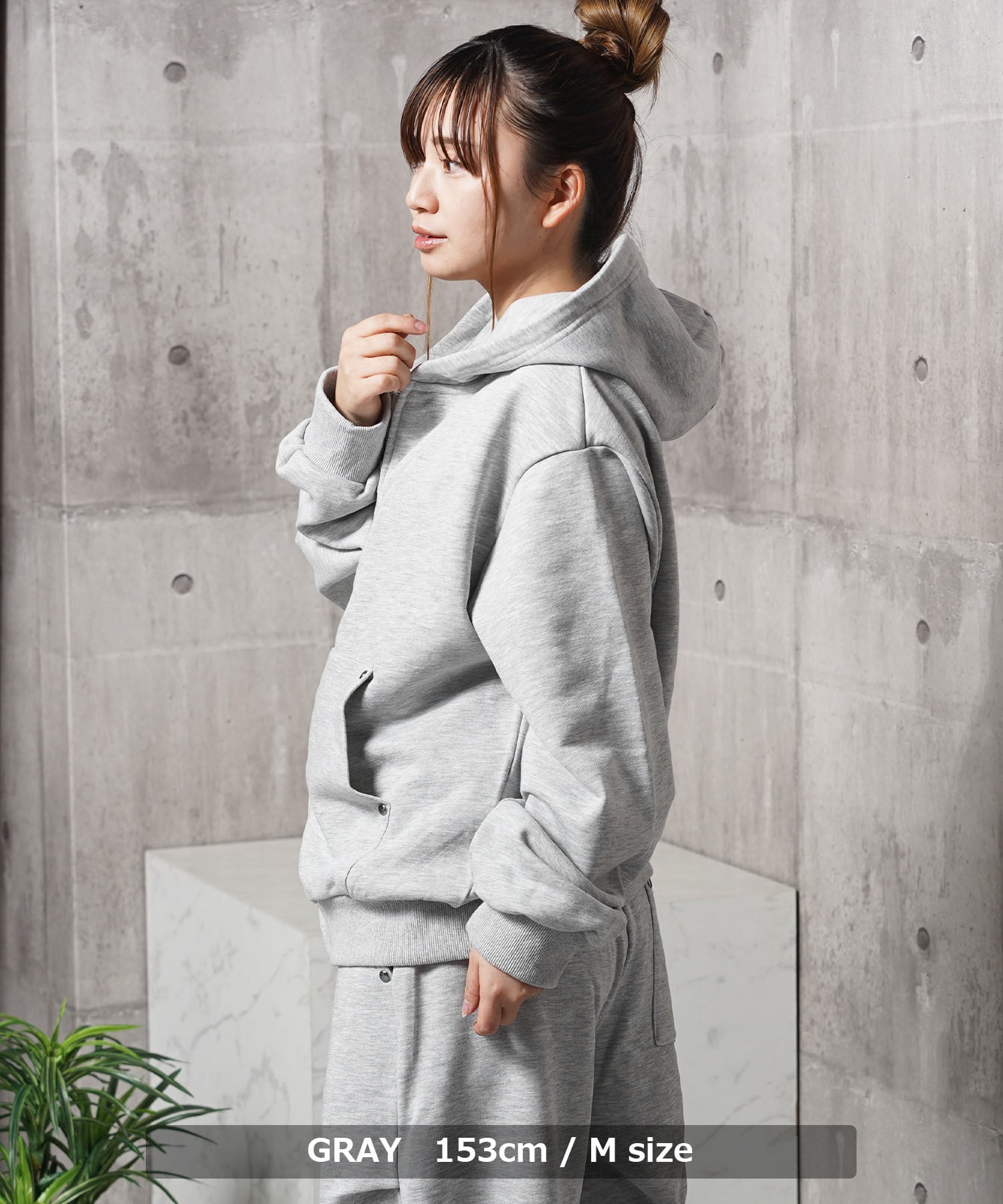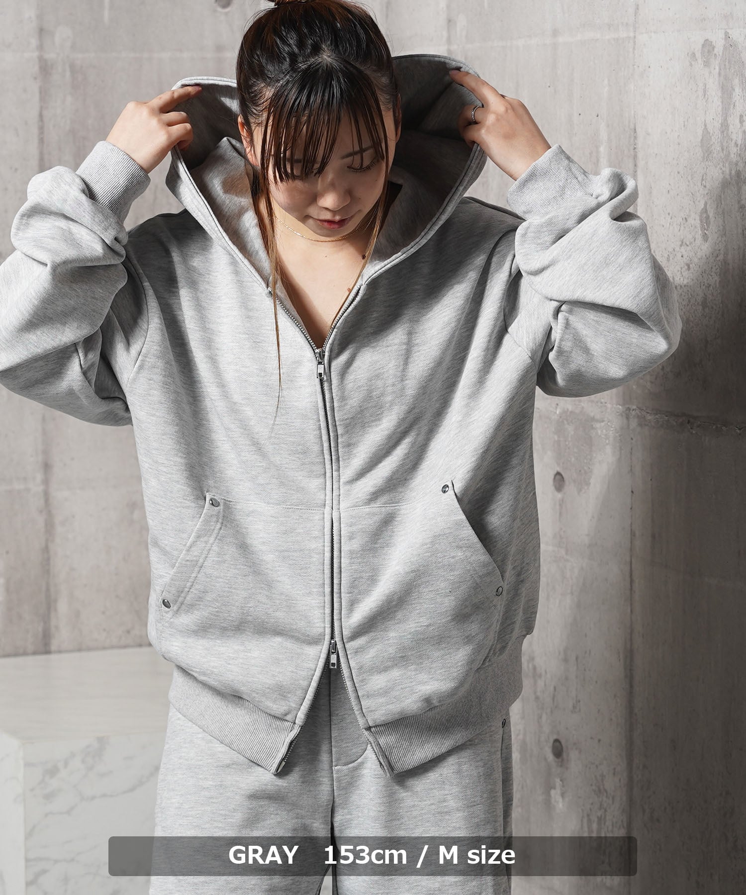同素材のスウェットパンツと合わせたセットアップもおすすめ。