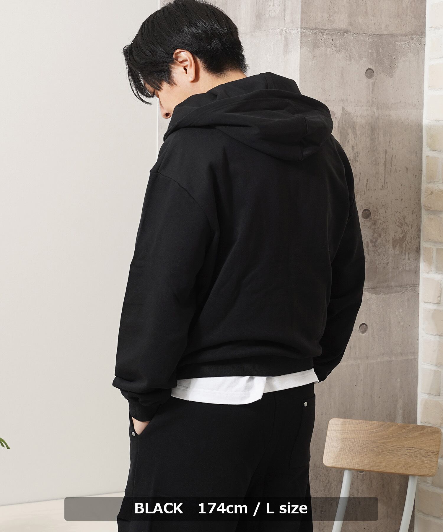 身幅を広くとったボックスシルエットに、存在感のある大きめなフードを合わせることで、旬なルーズ感をプラス。