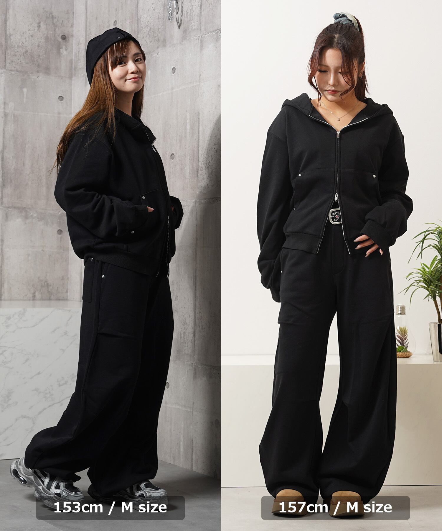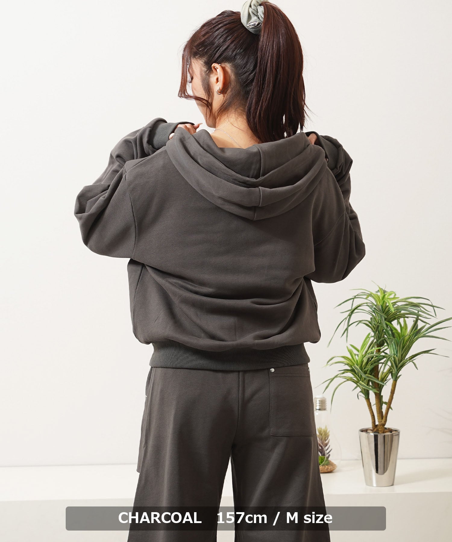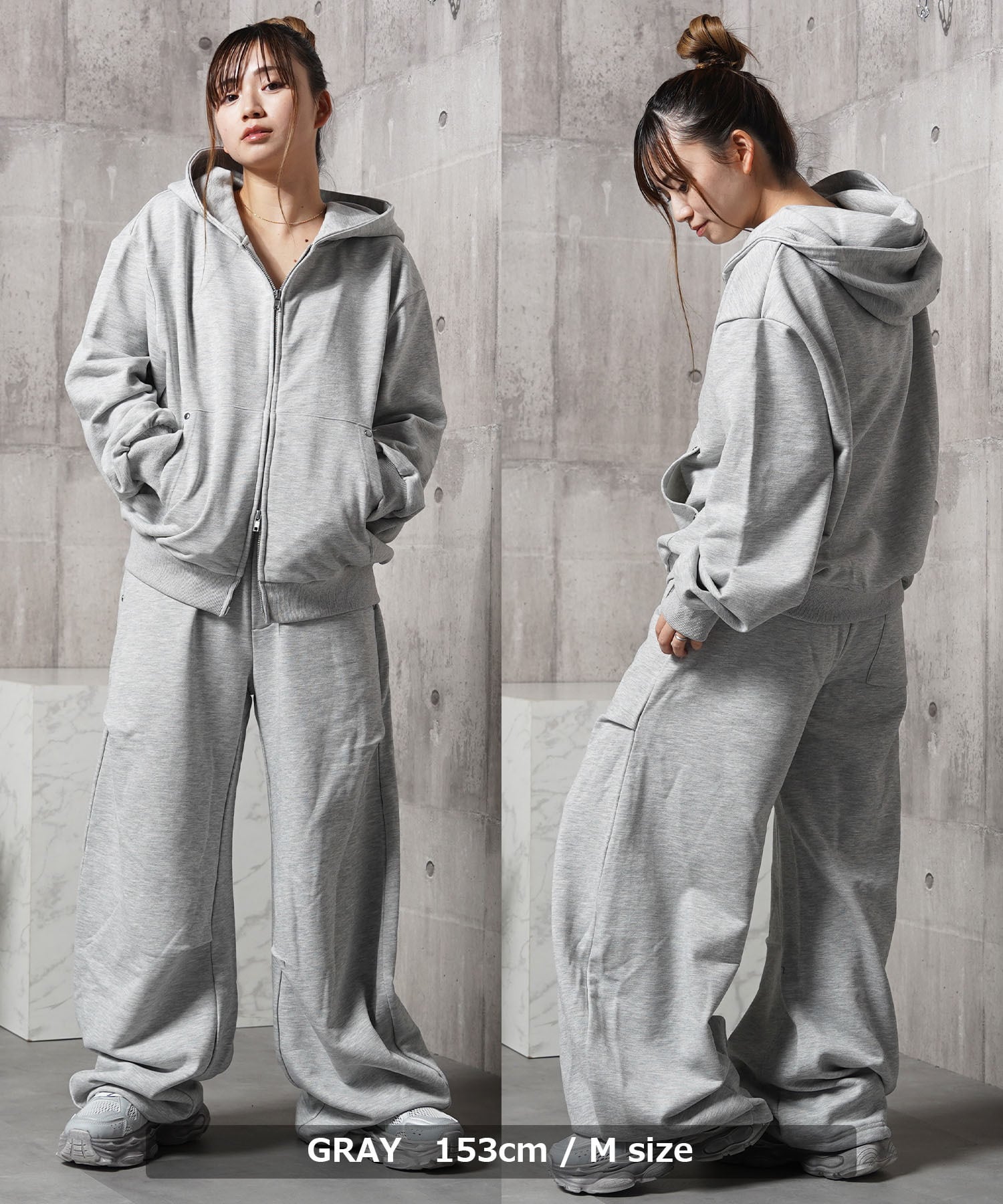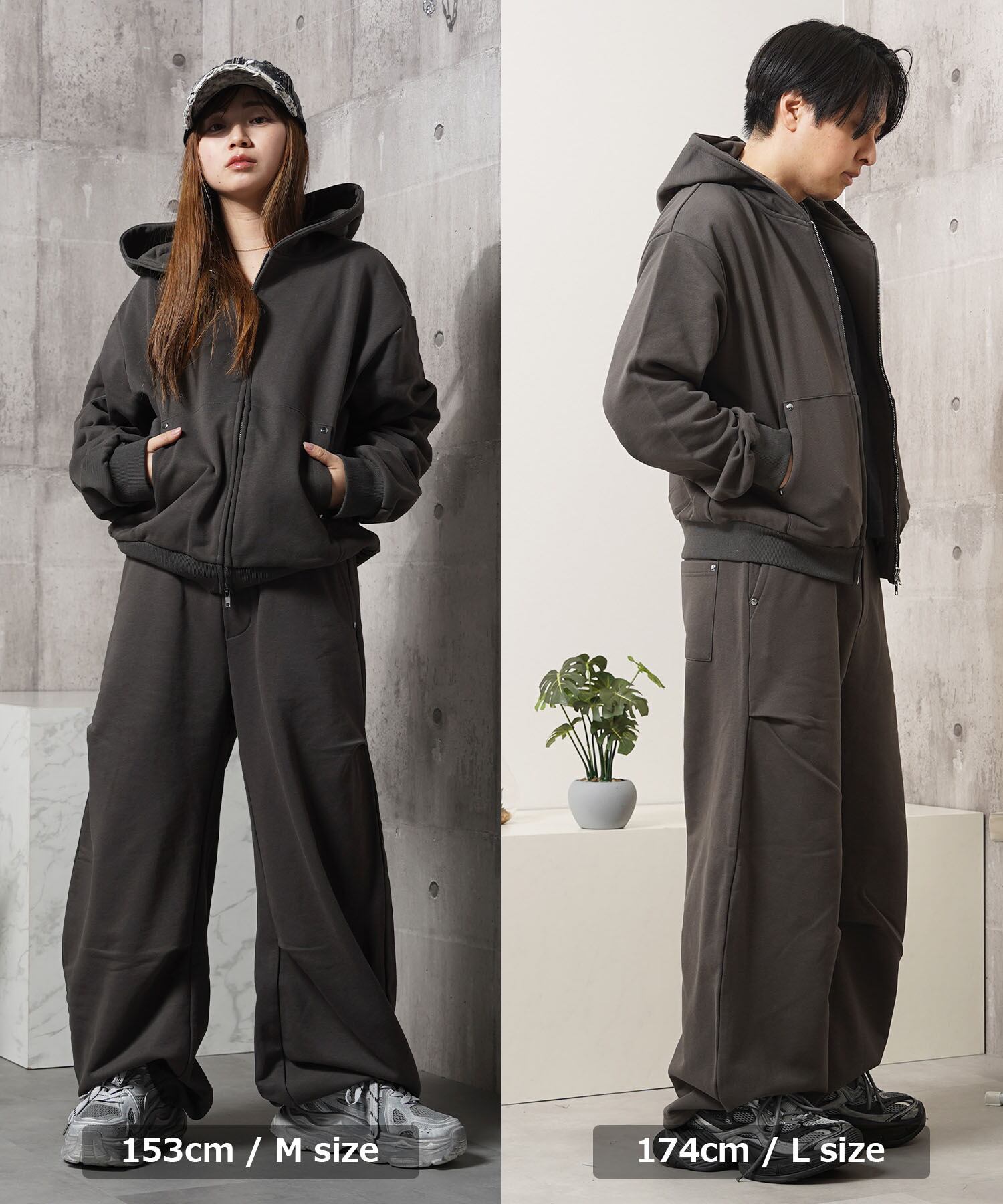 同素材のスウェットパンツと合わせた、統一感のあるセットアップスタイルが特におすすめ。
