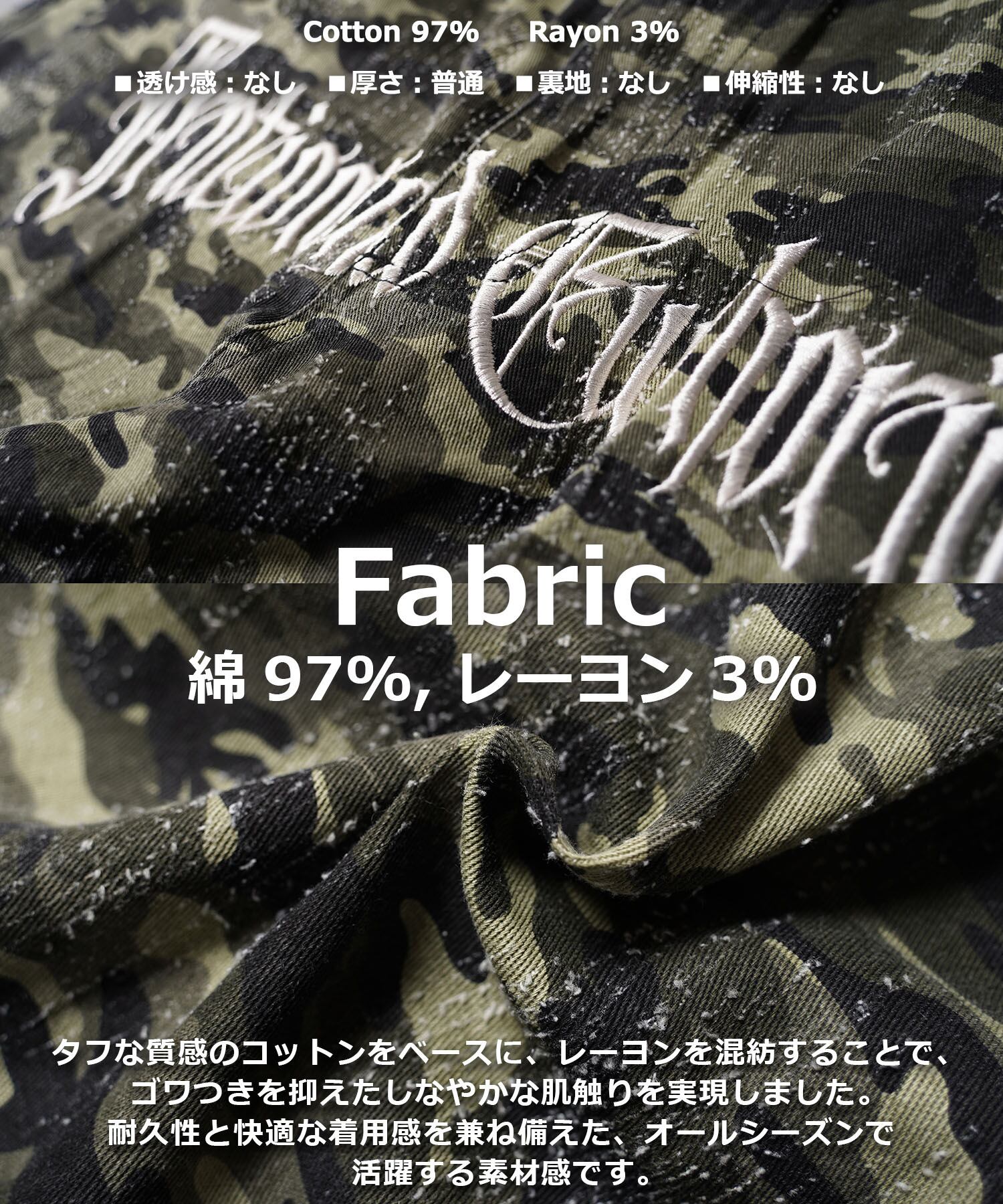 タフな質感のコットンをベースに、レーヨンを混紡することで、ゴワつきを抑えたしなやかな肌触りを実現しました。