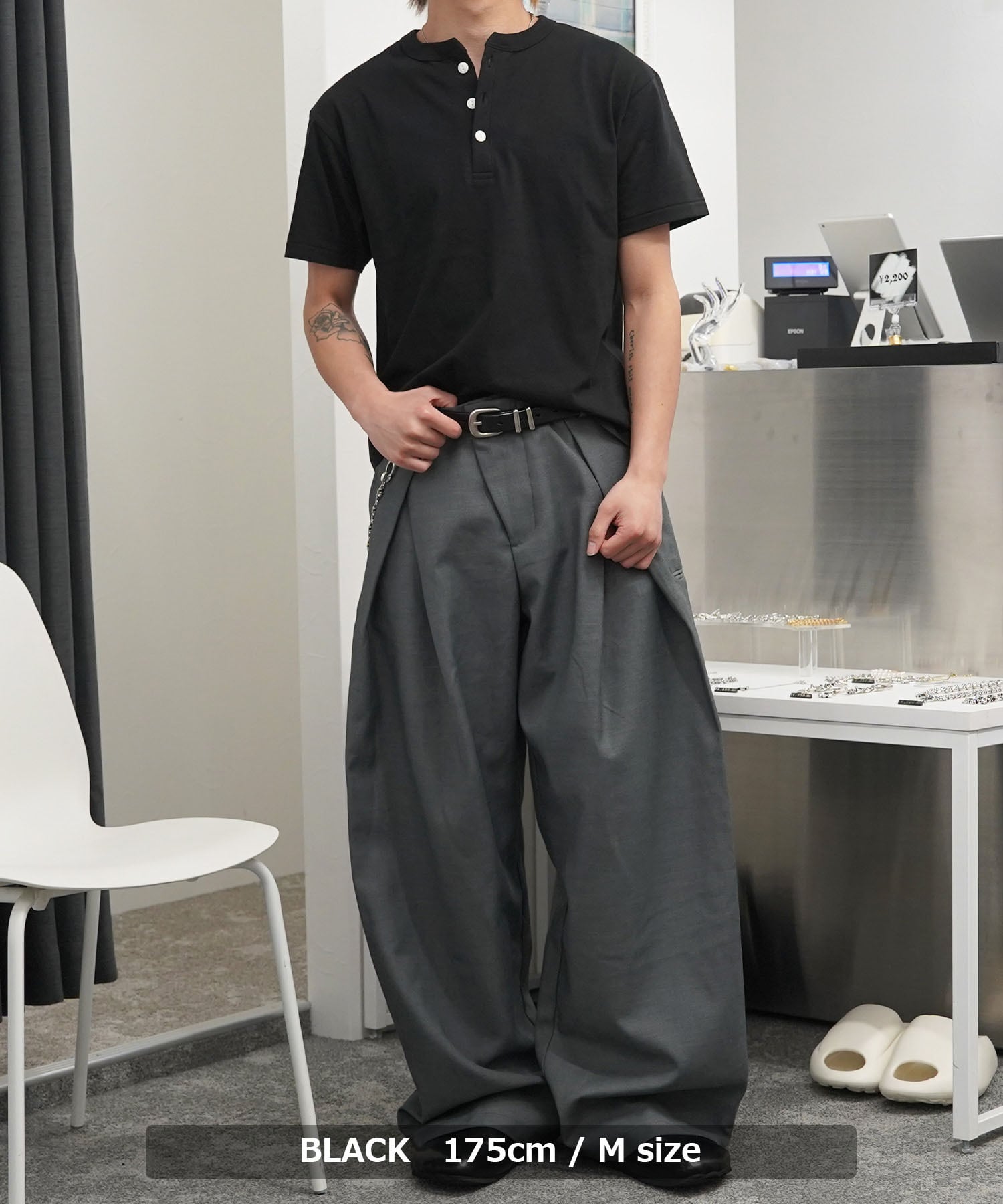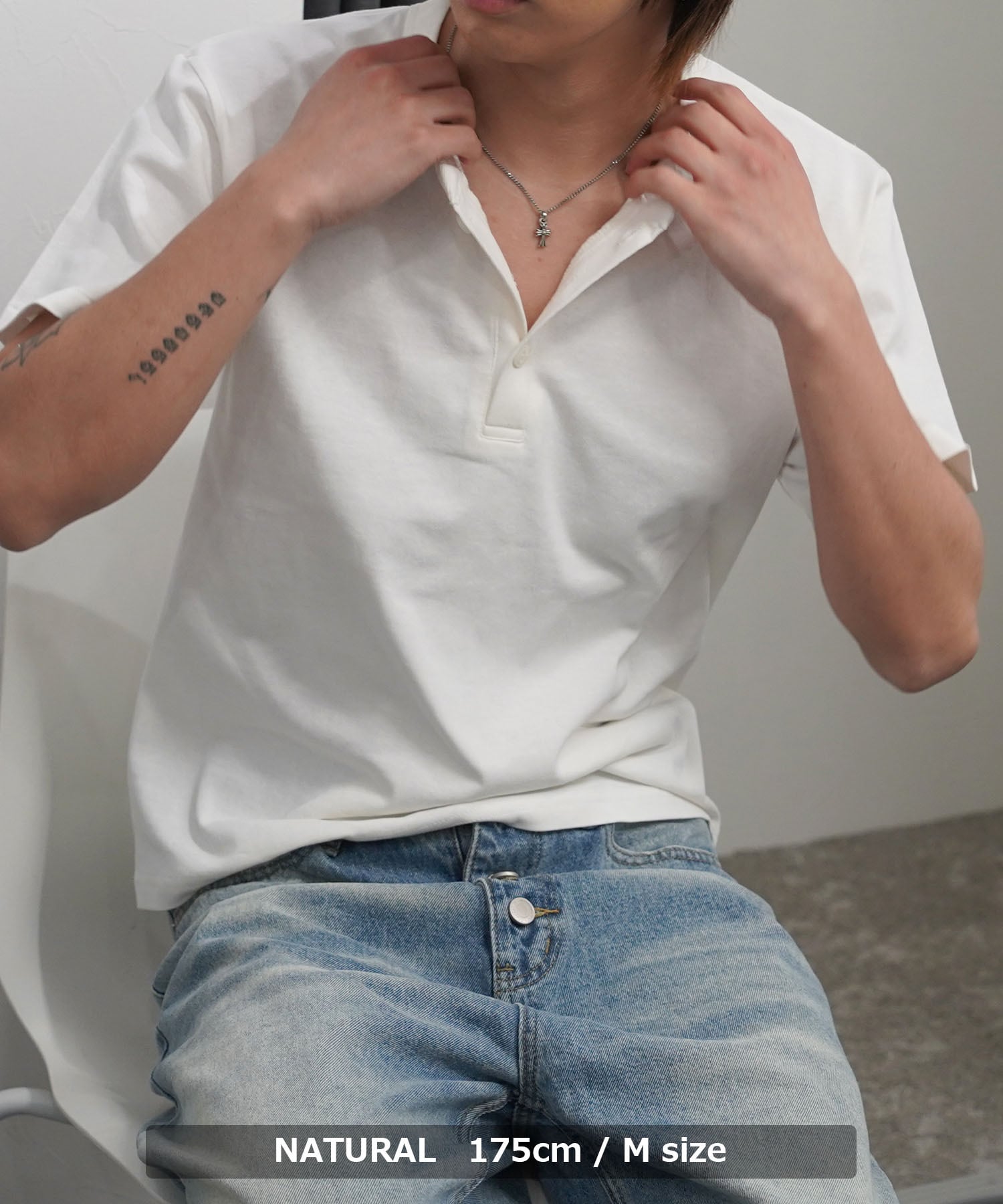 首元はボタンの開閉によって表情を変えられるヘンリーネックを採用し、程よい抜け感と男らしさを両立。